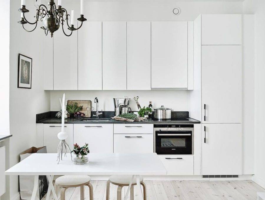Белая кухня еще не полностью исчерпала возможности выбора цвета. Хотя в небольших комнатах стоит выбирать яркие цвета, мы найдем целую палитру цветов, которая обеспечит интересные визуальные эффекты. Светлая комната может иметь контрастные мебельные фасады, плитку или декоративное стекло над рабочей поверхностью.