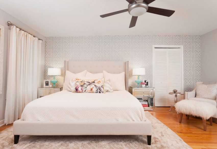 Здесь гораздо больше вариаций для отделки. Желательно, чтобы основным тоном был светлый, но из холодной палитры – серый, белый, голубой, мятный. Каждый из них наполнит спальню свежестью и поддержит световой баланс.