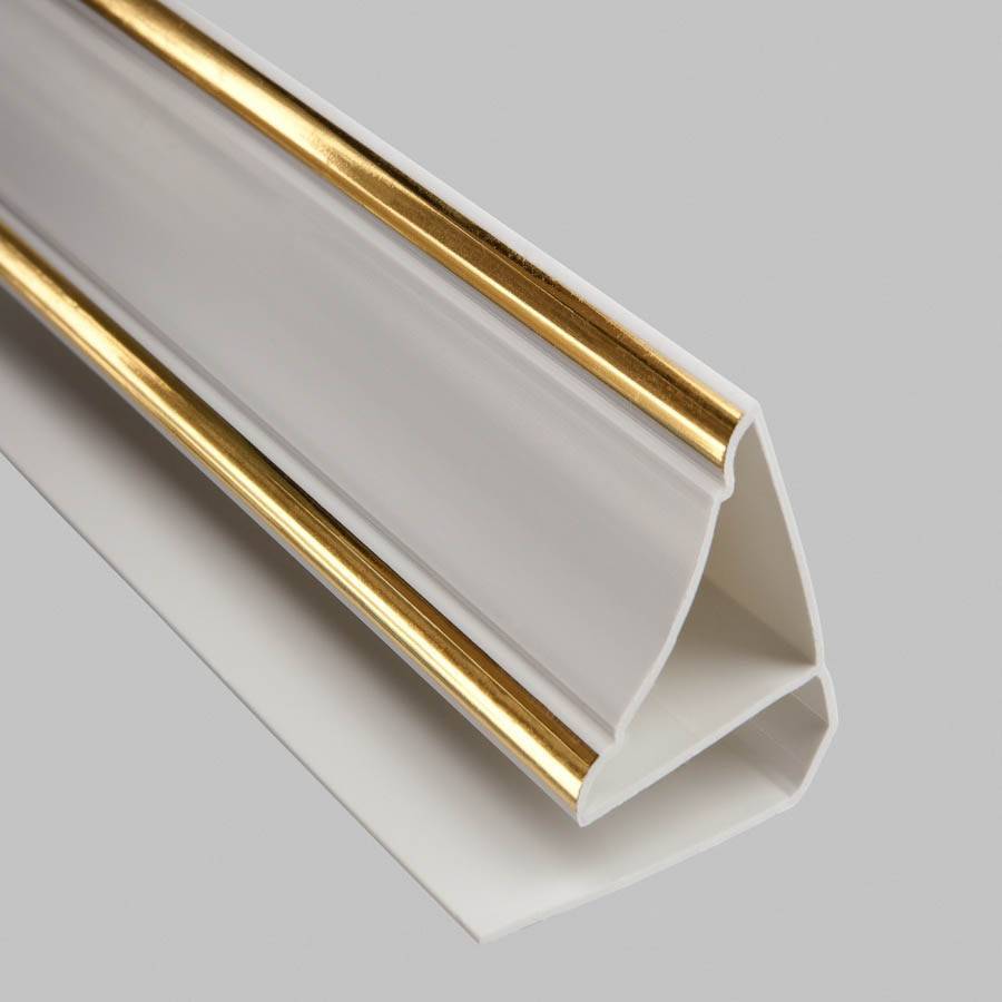 - Галтели из ПВХ. Данный вариант лучше всего гармонирует с отделкой пластиковыми панелями. К тому же многие разновидности имеют специальный паз для более быстрой установки. Кроме того, ПВХ плинтус для натяжного потолка является отличным решением.