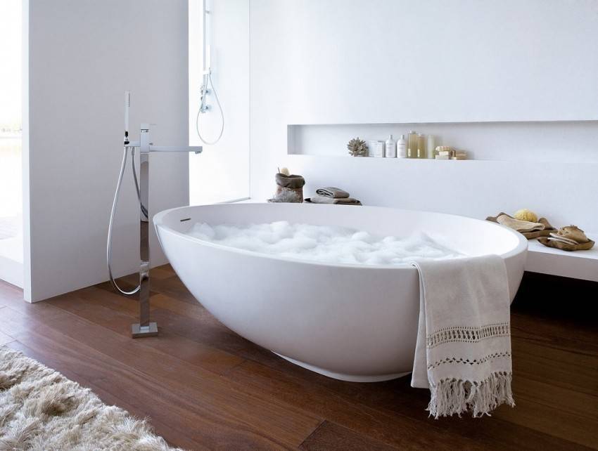 Этот материал – мечта дизайнера, в нем можно воплотить даже самую замысловатую форму, создать модель, которая гармонично впишется в любой интерьер. На этом плюсы ванн из акрила не заканчиваются. Они отлично держат тепло. Температура воды в акриловой ванне за полчаса снижается всего на один градус. Этот показатель даже лучше, чем у чугуна. Звукоизоляция у них тоже отменная. А легкость материала позволяет без проблем доставить и установить ванну в любом помещении.