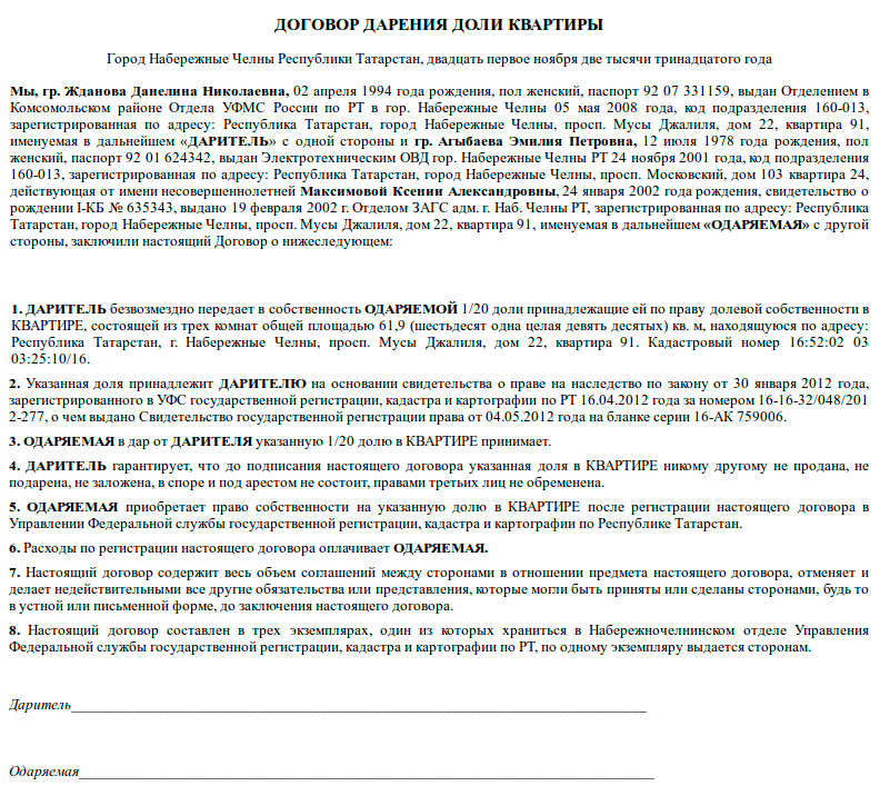 - Квартира куплена одиноким родителем или принадлежит одному супругу согласно брачному договору. Если недвижимость находится в личной собственности родителя, выделяют доли только на детей. Для оформления договора нотариус не требуется.