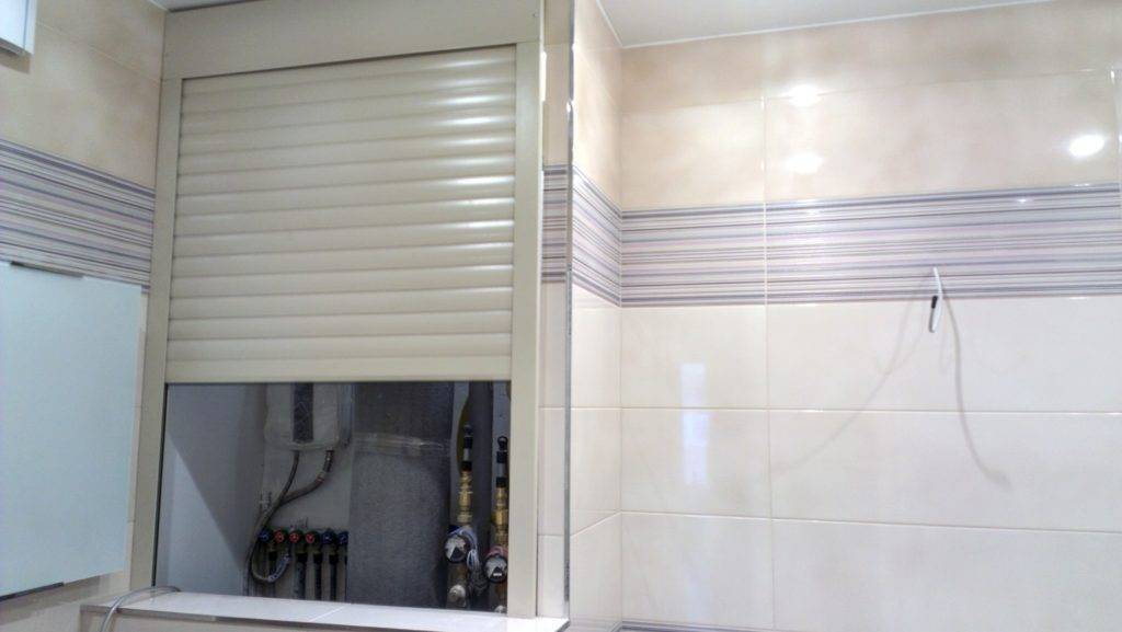 Для установки роллет сооружают короб. Если стояк помещен в нишу, то рольставни крепятся сверху закрывающего ее короба, а при наличии выступающих элементов коммуникаций их обносят гипсокартоном и в центр помещают подъемный механизм.