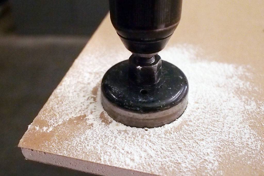 - Сначала дыре придают правильную форму. Используют для этого нож либо дрель с насадкой «коронка» и делают круглое отверстие. Оно должно быть больше диаметра самой дыры хотя бы на 2–3 см.