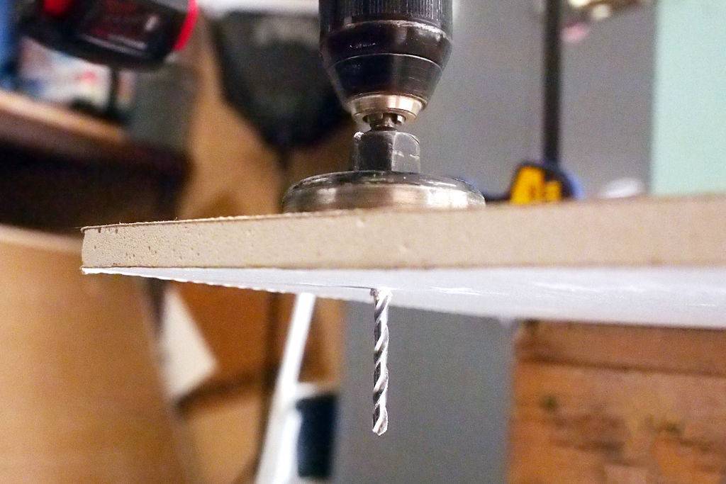 - дощечку прикрепить к внутренней стороне стены из ГКЛ, предварительно вкрутив в ее центре саморез для удобного удерживания материала;