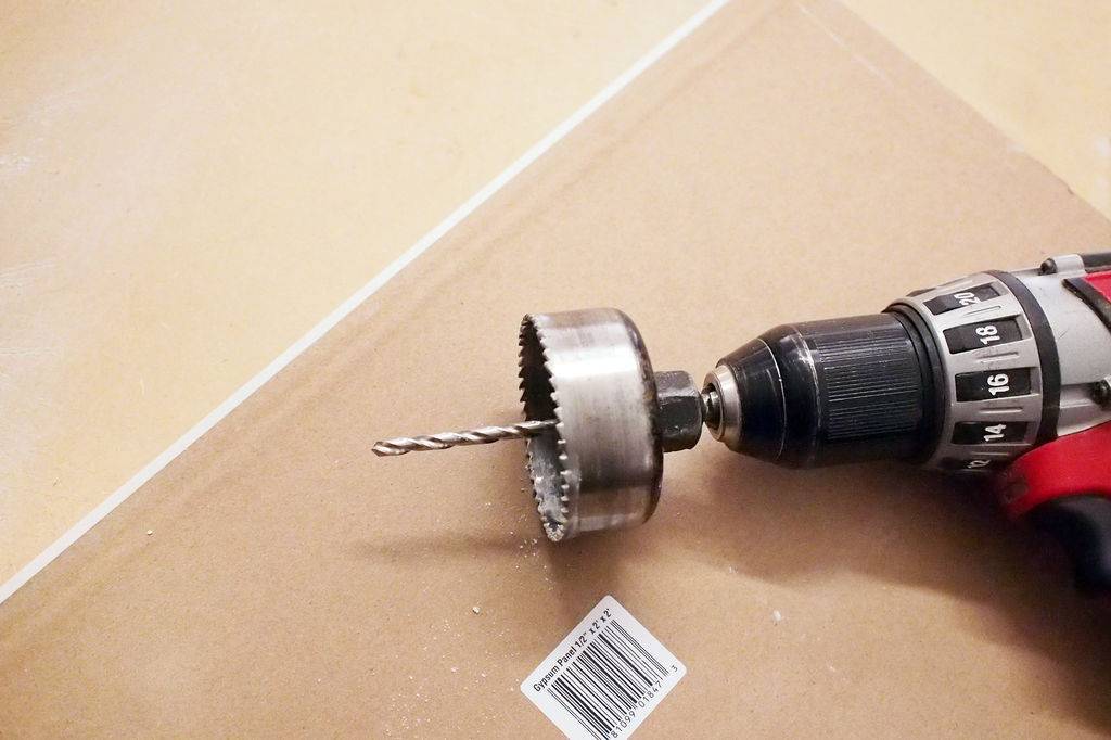 Такую дырку проще всего заделать с помощью «заплаты» вырезанной из куска гипсокартона. Она может быть круглой или прямоугольной формы. Проще всего изготовить круглую. Ее можно сделать с помощью насадки для дрели – «коронки» для гипсокартона.