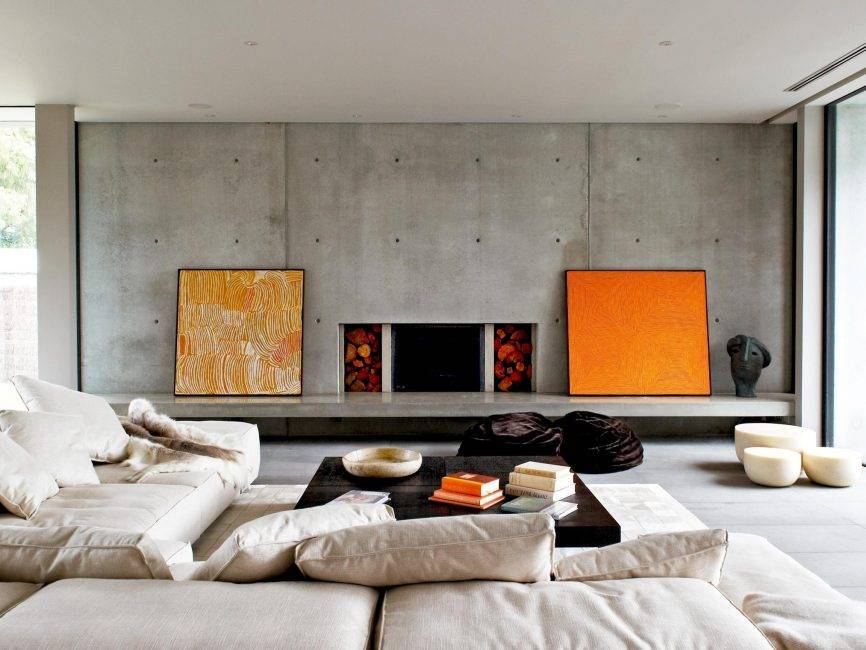 Полы из дерева или же бетона, табу на большие ковры. В крайнем случае, это может быть небольшого размера коврик, на котором можно удобно устроиться у камина или телевизора. Стены, как уже отмечалось, остаются без какого бы то ни было покрытия: здесь можно лицезреть: