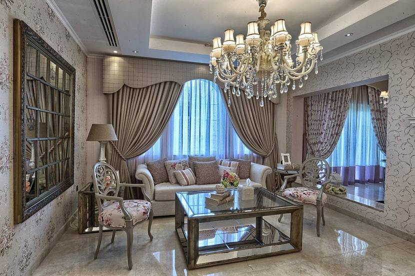 Классический стиль интерьера заполнен множеством источников освещения. Главным элементом выступает массивная кованая или хрустальная люстра. На стенах зачастую присутствуют оригинальные бра, перекликающиеся с люстрой, а для создания особенно уютной атмосферы можно добавить нижний свет. Рядом с креслами и диванами уместно расположить торшеры и настольные лампы.