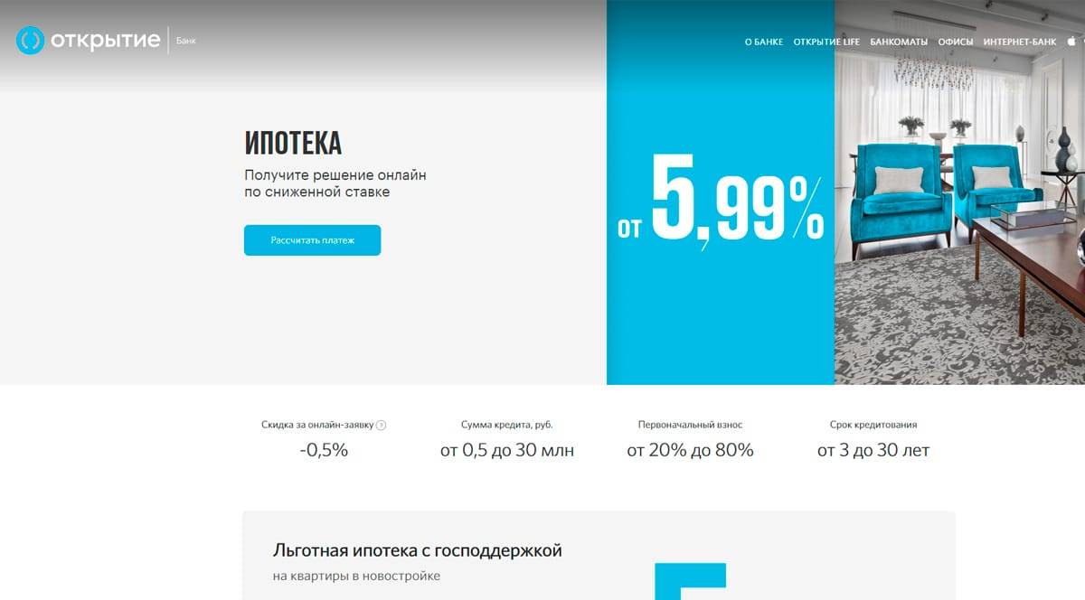 Если ищете, где взять ипотеку на самых выгодных условиях с низкой процентной ставкой, обратитесь в банк Открытие. На сайте можно взять ипотечный кредит на покупку вторичного жилья и квартиры в новостройке. Прежде чем заполнить заявку, можно воспользоваться онлайн калькулятором и получить скидку -0.5%. Укажите стоимость недвижимости и срок ипотеки, чтобы получить самое выгодное предложение.