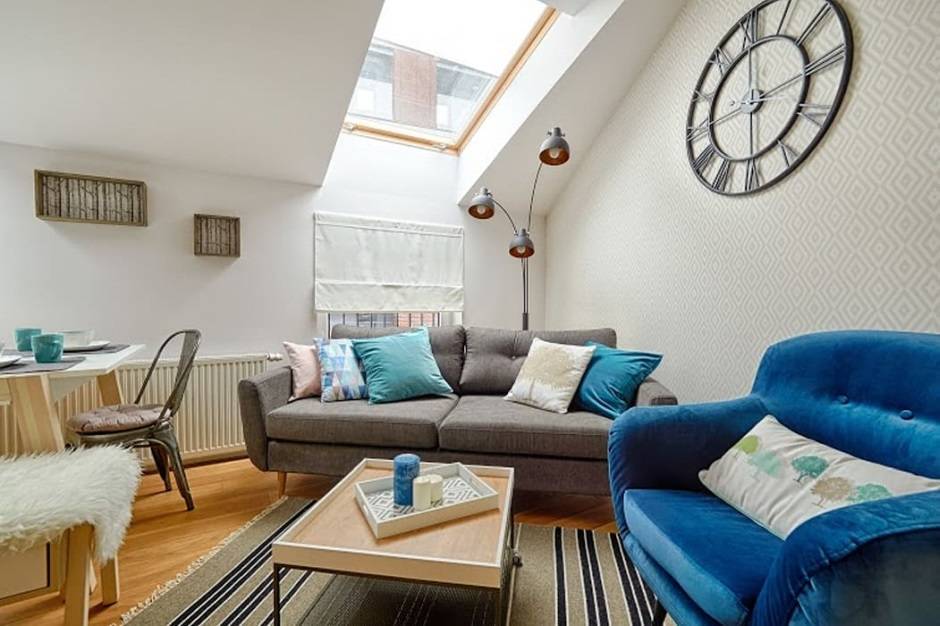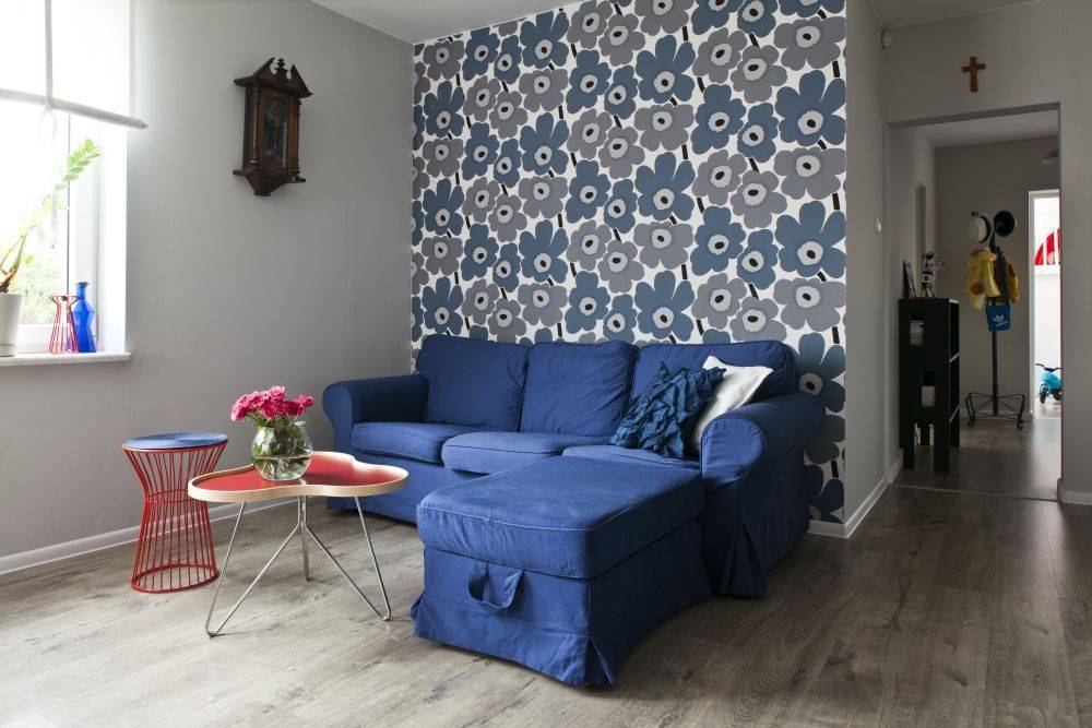 Легкая непринужденная атмосфера на фоне голубых обоев в сочетании с бежевыми в мелкий рисунок