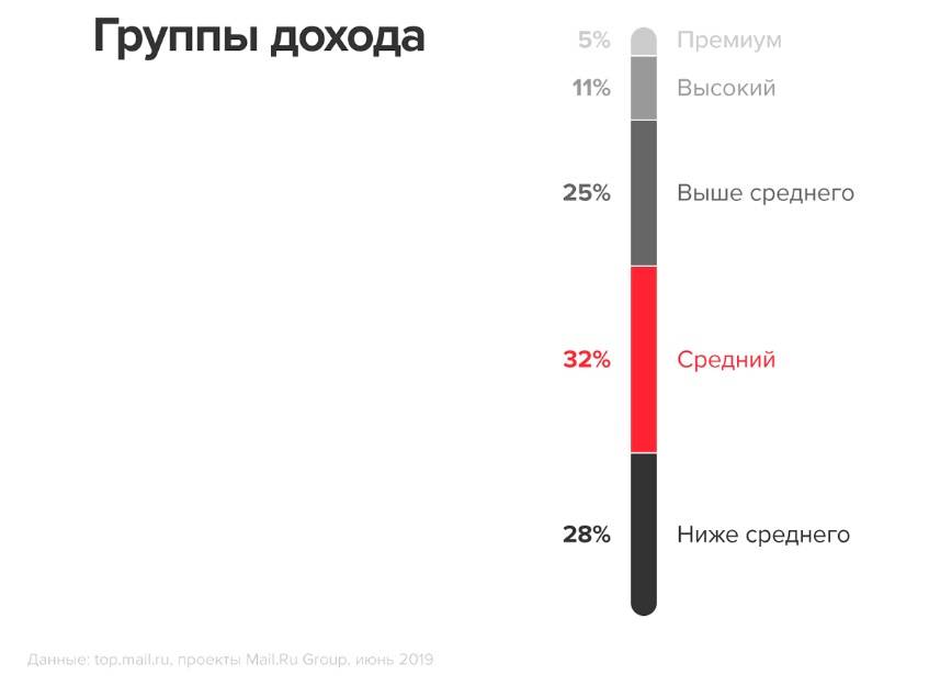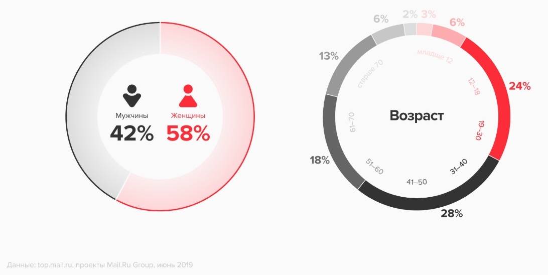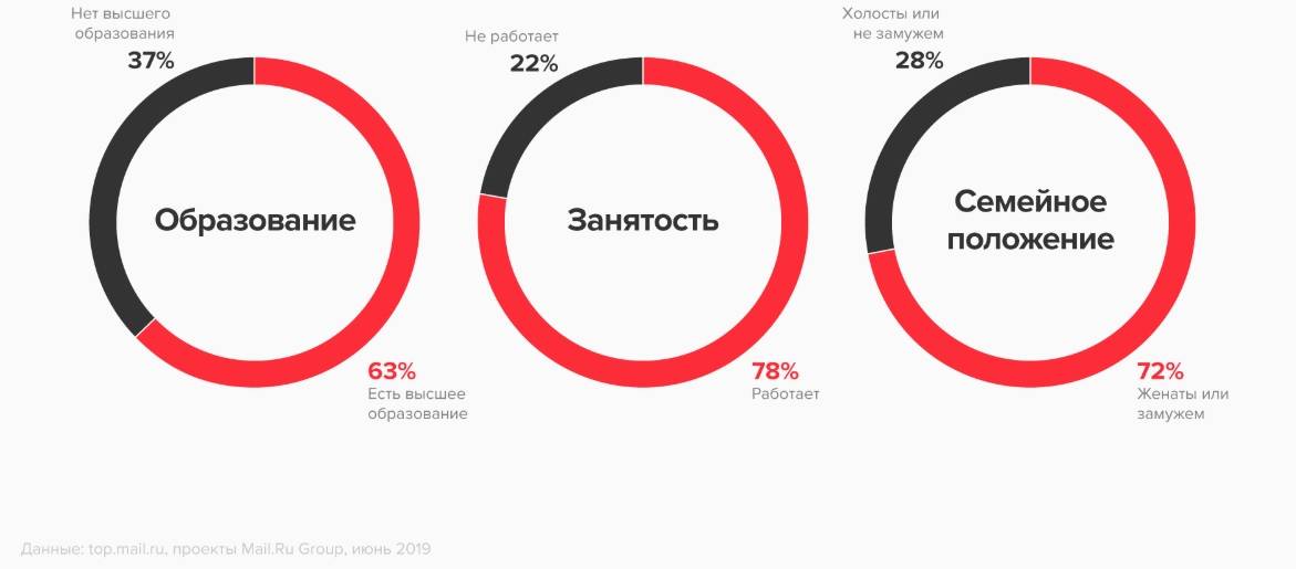 По данным опроса Mail.ru Group, недвижимостью интересуются по большей части женщины — 58% аудитории. Среди всех пользователей: 70% — в возрасте от 19 до 50 лет, 60% имеют средний доход или ниже, 72% состоят в браке, 63% имеют высшее образование и 78% работают.