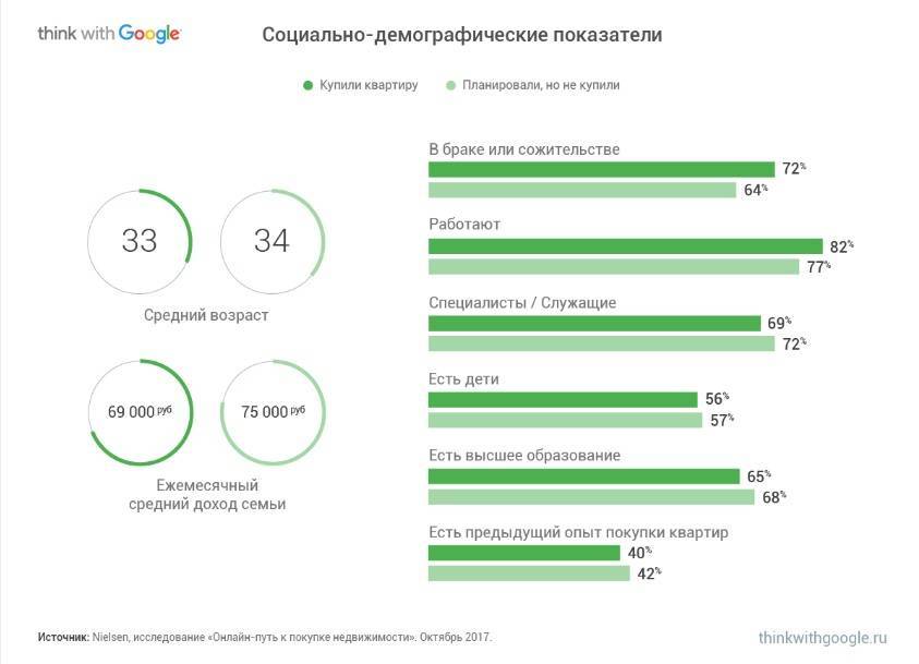 Более 80% покупателей состоят в браке или отношениях, а также у большинства — один или два ребенка. А покупают недвижимость чаще, чтобы улучшить жилищные условия, например, съехать со съемной квартиры.