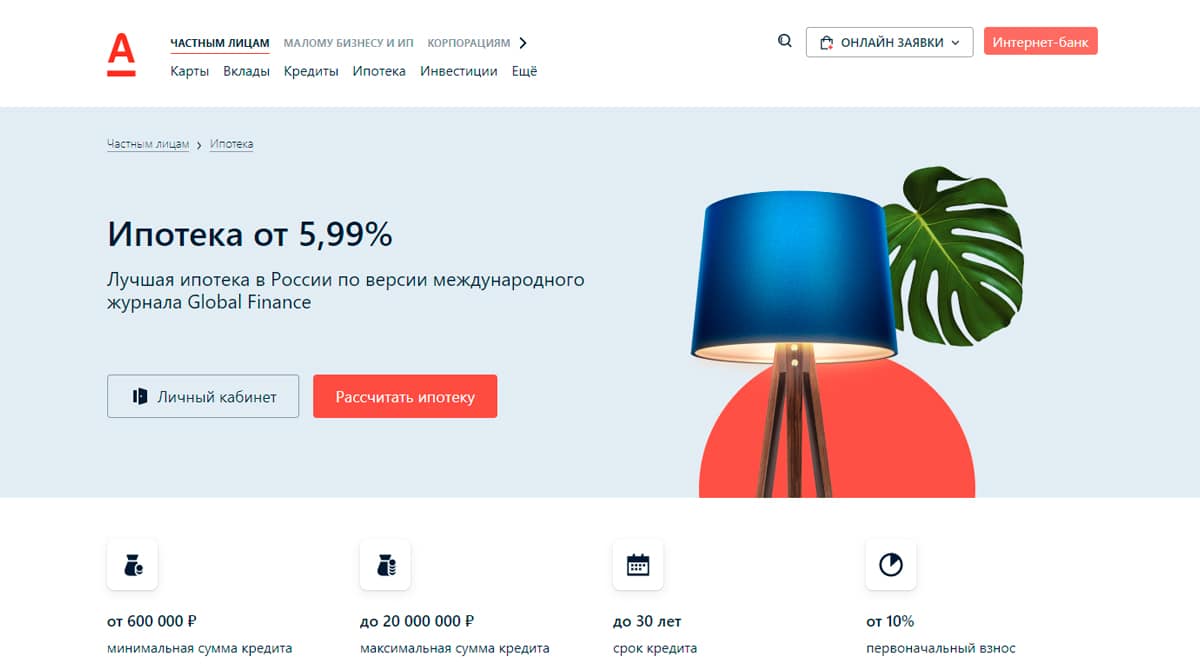 В Альфа-Банке низкий процент на ипотечный кредит и выгодные условия для оформления. Банк выдает средства на строящееся жилье под 5.99% годовых с поддержкой от государства. Чтобы определиться с итоговой суммой и просчитать ежемесячный платеж, стоит воспользоваться онлайн калькулятором. Для этого необходимо указать стоимость недвижимости, величину первоначального взноса и срок кредитования.