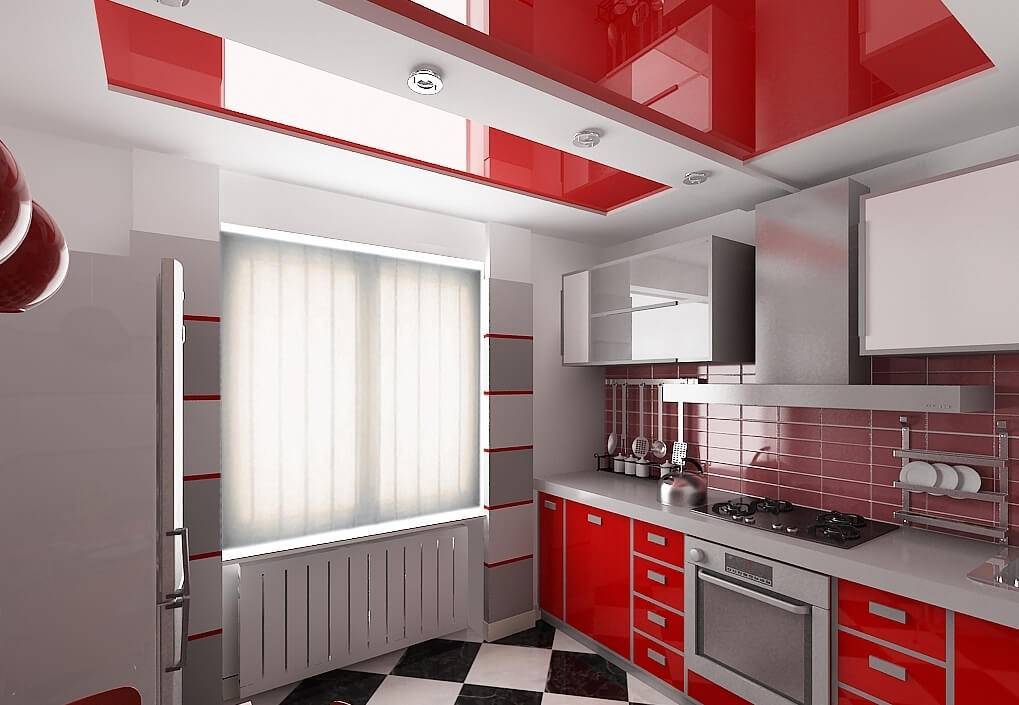 Очень сильный цвет. Далеко не каждый может решиться на красный потолок в кухне. Обычно столь яркой делают лишь часть потолка, или размещают красный рисунок на белом, либо нейтральном фоне. Это может быть фотопечать, вырезные 3D-потолки, или рисунок специальными красками по тканевому полотну.