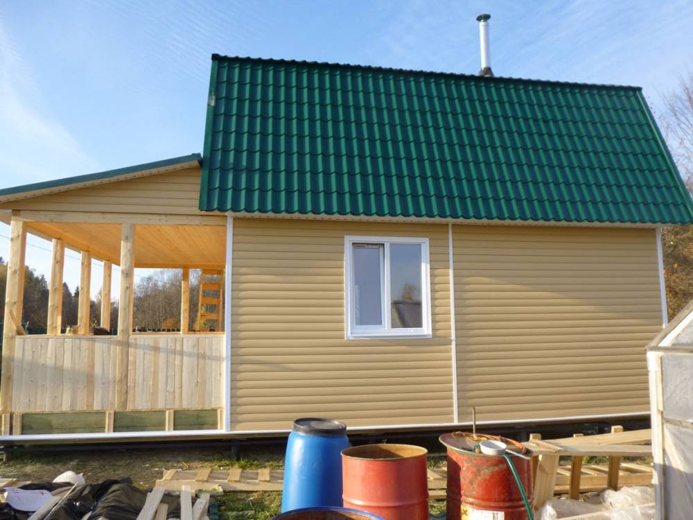 Точно также обшейте фронтоны строения. Затем стены можно отделать любыми «сухими» фасадными отделочными материалами, такими как вагонка, сайдинг, термопанели и т.д. С внутренней стороны обшейте стены вагонкой. Если вы не знаете, как крепить к стене вагонку, прочитайте статью, посвященную данной теме.