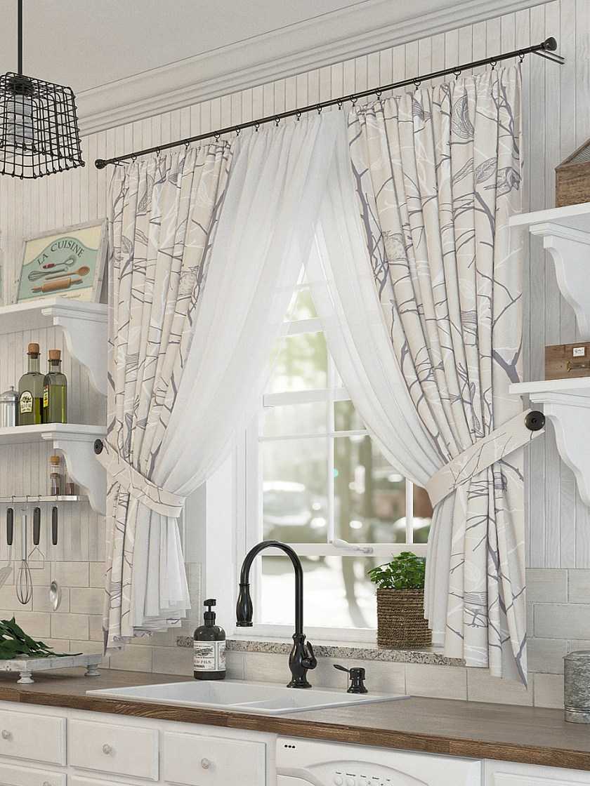 Если помещение довольно габаритное, то не стоит откладывать использование штор в интерьере. Они меняют внешний вид кухни в лучшую сторону, при этом скрывают от посторонних взглядов (актуально, если квартира расположена на первом этаже). Сейчас выпускают множество перекладин интересной и необычной формы.