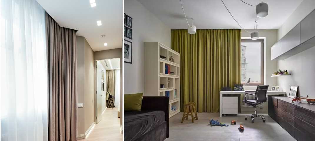 А в комнатах с высоким потолком, наоборот, такие портьеры будут уместны и создадут впечатление комфорта. А также в невысоких комнатах не рекомендуется вешать короткие портьеры.