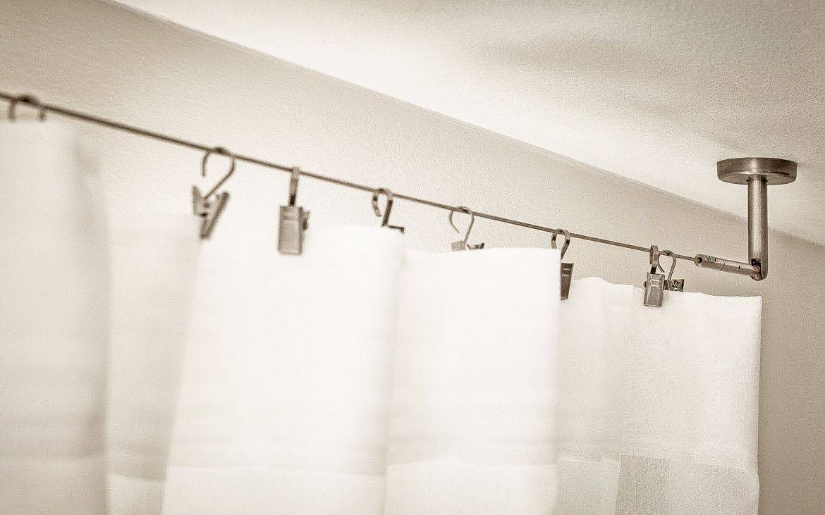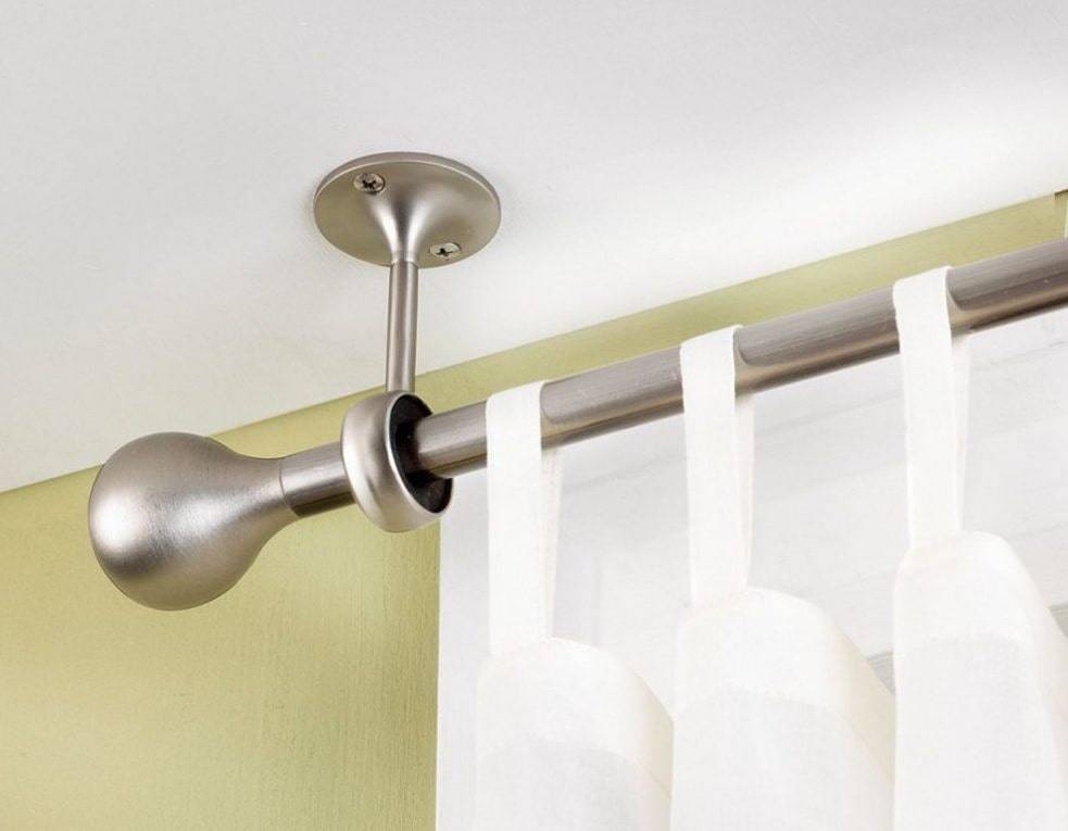 Этот вариант очень похож на настенный за исключением того, что кронштейн крепится не к стене, а к потолку. В комплекте идут крючки, на которые вешают занавеси