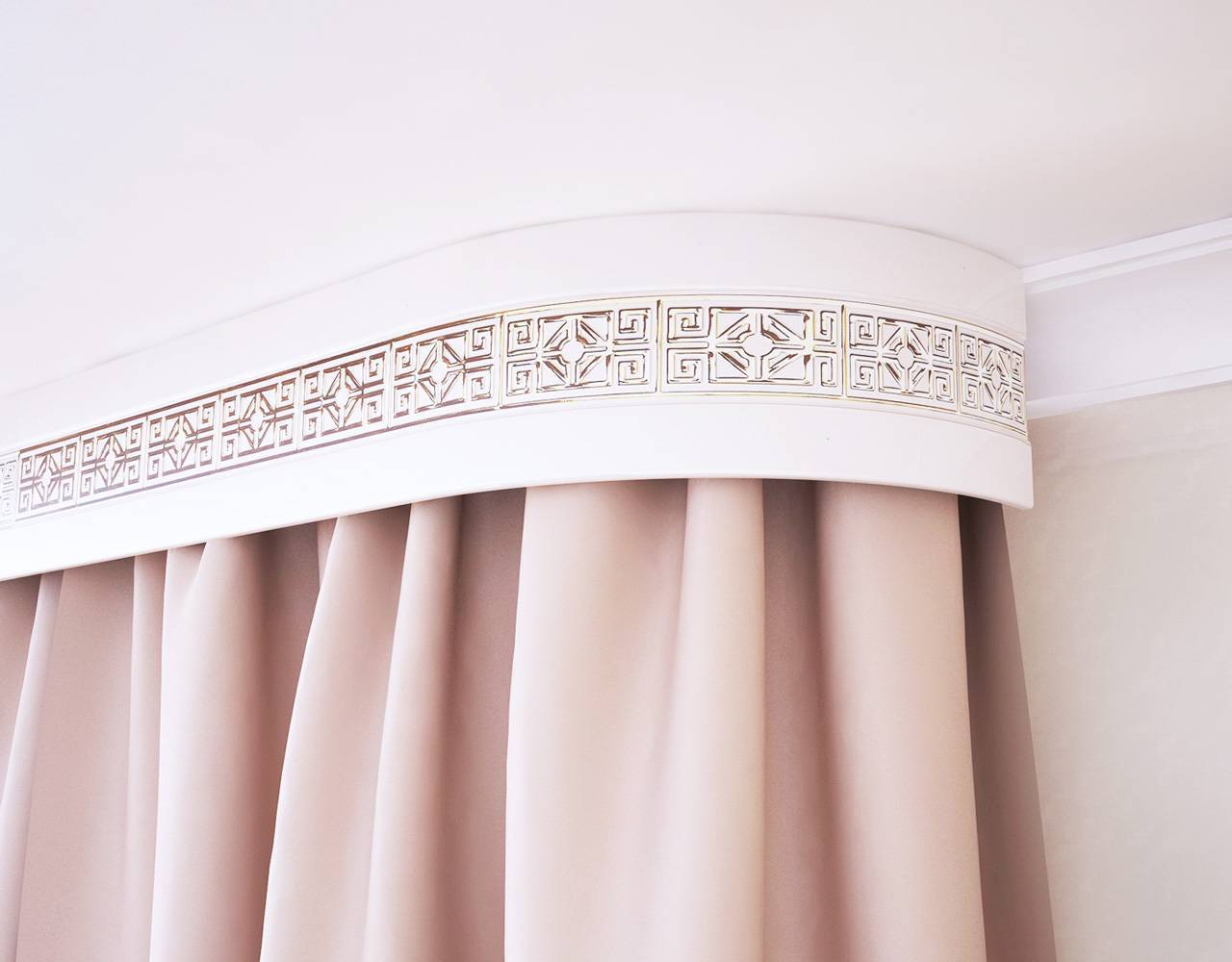 Смотрятся такие гардины очень изысканно. Самыми бюджетными вариантами являются пластиковые модели. Дороже всего стоят багеты из натуральной древесины. Они крепятся к потолку. Внутренняя часть карниза оказывается полностью закрытой широкой планкой, концы которой могут закругляться или быть угловыми. Их преимущества: