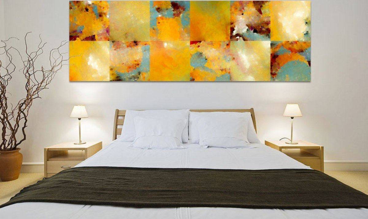 - несомненным хитом продаж стали модульные композиции, когда один законченный сюжет разделён на несколько отдельных картин, которые могут быть разными по форме и размеру. В спальне предпочтительно использовать модуль из 2-4 частей, потому что большее количество будет смотреться нагромождением и будет напоминать, скорее, картинную галерею, нежели спальню;