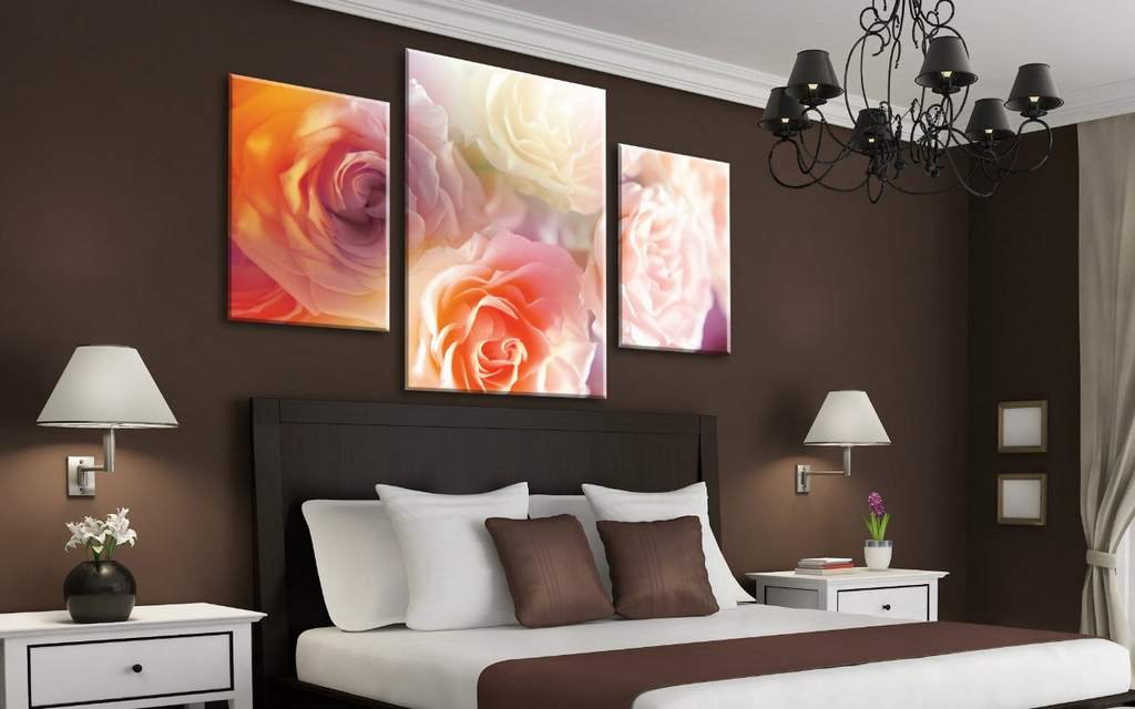 Что касается картин, то над кроватью их должно быть не больше трех. Причем желательно, чтобы они имели общую тематику и цветовую гамму. Для этого идеально подходят модульные картины. Это значит, что одно изображение разделено на две или три части. На стене их размещают с небольшим отступом друг от друга. Но тем не менее картина смотрится очень красиво, а главное – целостно.