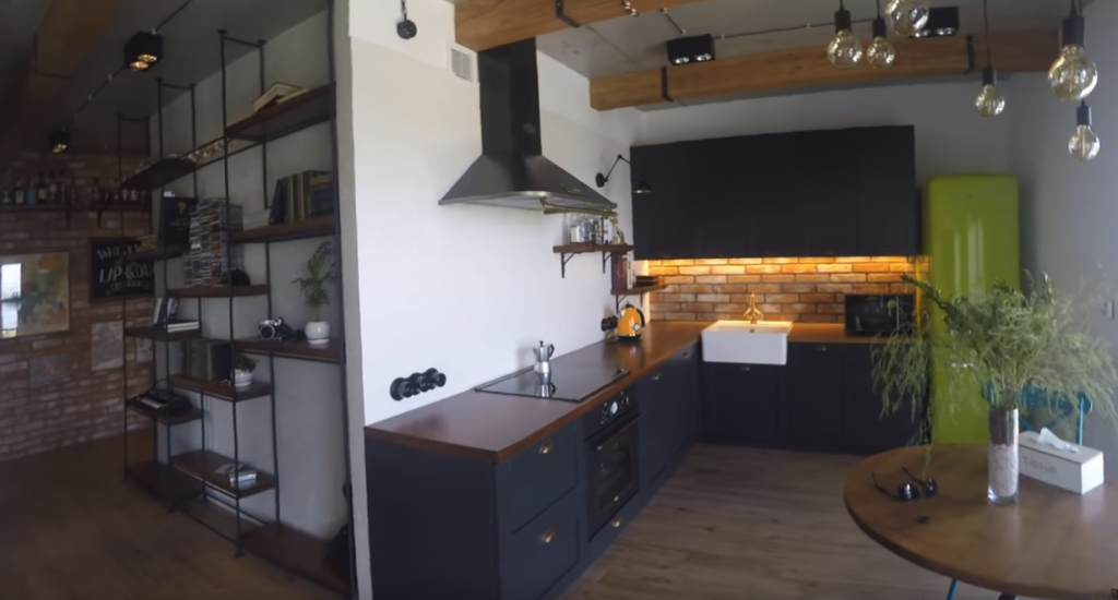 Современная кухня должна быть не только привлекательной, но и функциональной, практичной. Кирпичная кладка в интерьере, что является характерной чертой стиля индастриал, предоставляет все эти возможности. Вовсе не обязательно при помощи кирпича выкладывать все стены, достаточно только отдельных элементов. Лучше всего при помощи этого материала отделывать рабочую зону. Преимуществ в данном случае масса: