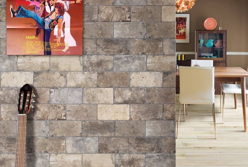 Кроме использования настоящего кирпича, может быть применена его имитация, обои подходящей расцветки или плитка соответствующей стилизации.