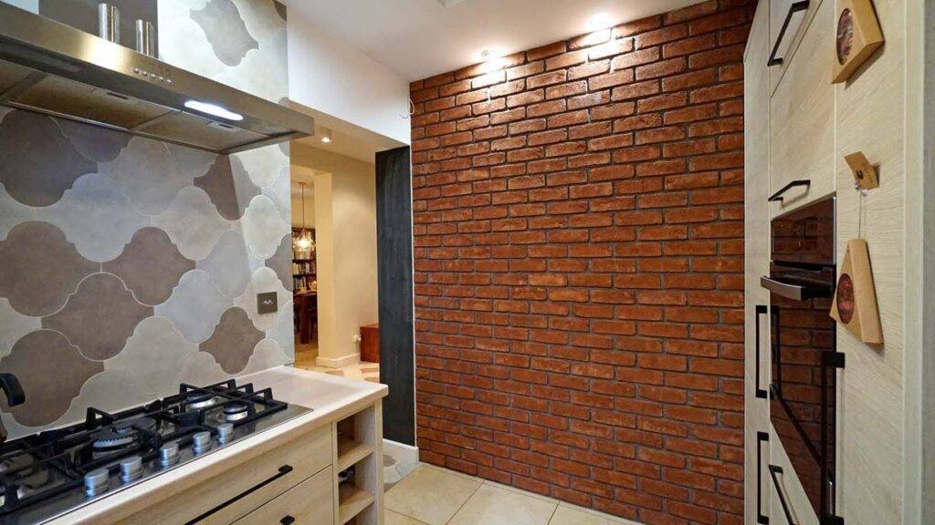 Отделка рабочего фартука на кухне кирпичом