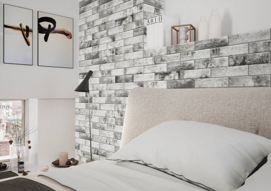Спальня с кирпичной стеной считается необычной и привлекательной