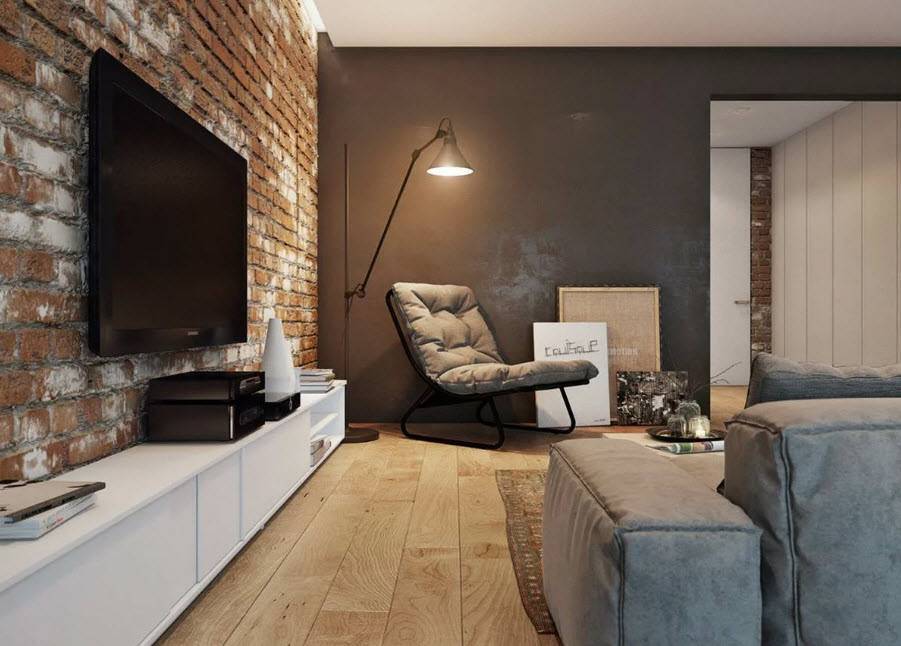 Интерьер гостиной с кирпичной стеной стал невероятно популярным