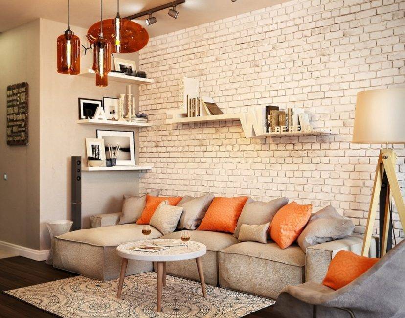 Кирпичная кладка в интерьере гостиной: