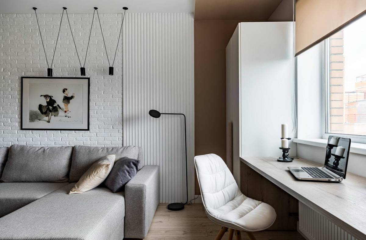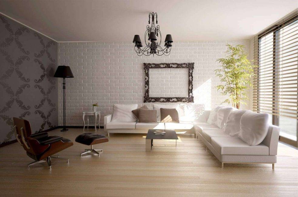 В небольшой гостиной такая отделка стен может утяжелить пространство. Смягчат обстановку выделяющие элементы: фотографии в рамках на стенах, ковер на полу, гардины и шторы на окнах. Белые вертикальные плоскости гармонично сочетаются с бежевой мебелью. Если гостиная совмещена с кухней или столовой, стена из белого кирпича может визуально разделить пространство на функциональные зоны.