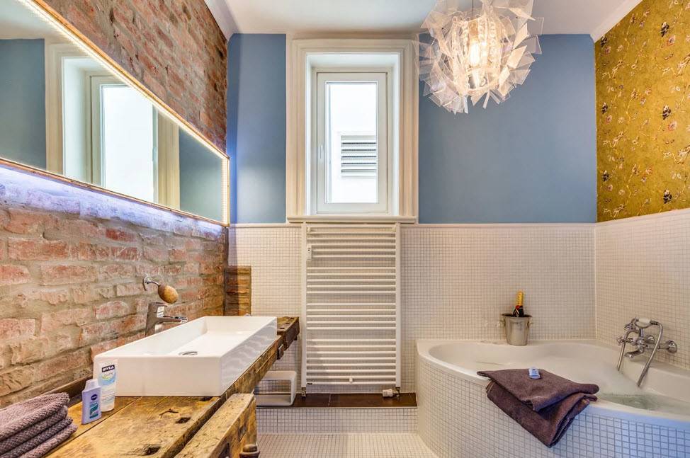 Избавиться от безликости и придать очарование ванной комнате поможет кирпичная стена. В этом помещении высокая влажность. Рационально использовать керамическую плитку или специально обработанный естественный белый кирпич.