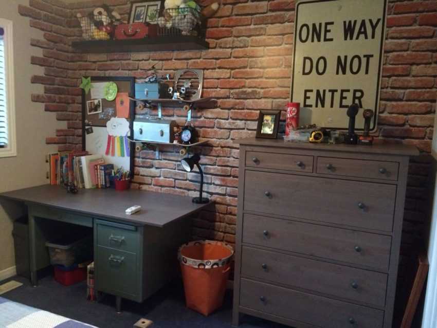 Кирпичная кладка в комнате подростка позволяет подросшему ребенку проявить свою индивидуальность. Кирпич хорошо сочетается не только с постерами, но и с граффити.