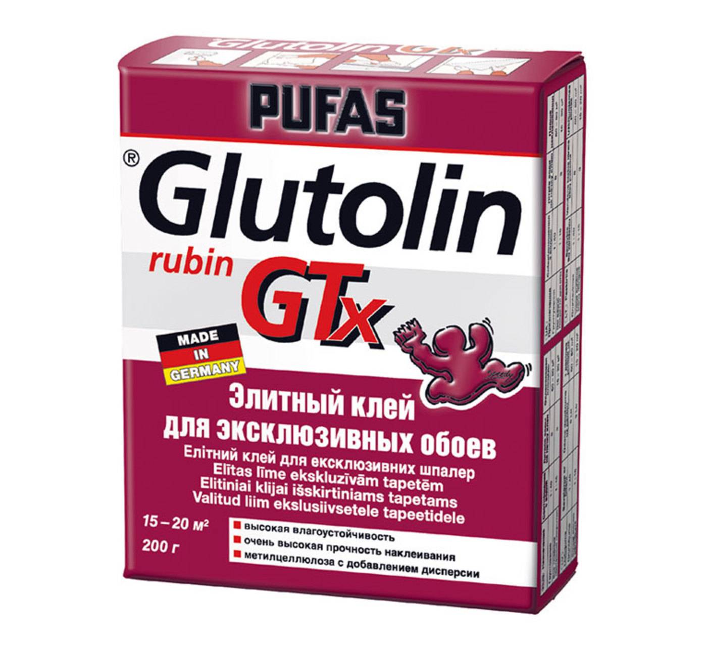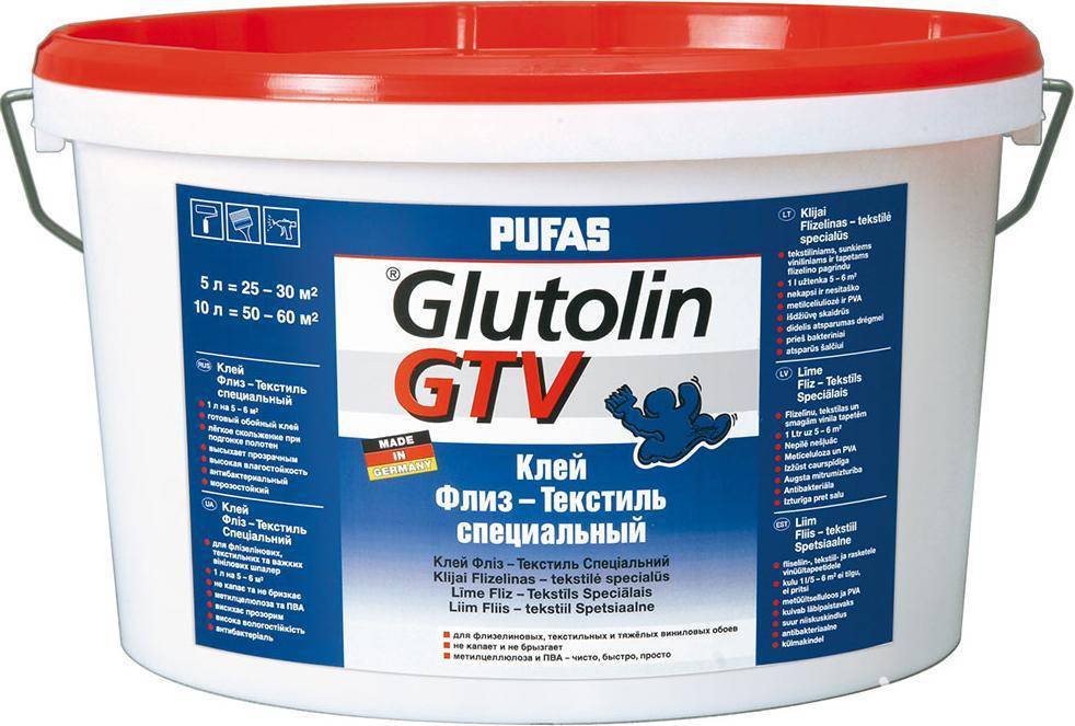 Требованиям стандарта клея для обоев «флизелин» подходит Pufas Glutolin с пометкой GTX. Приготовленная суспензия подходит для ручного и механического нанесения. Клей флизелиновый гарантирует повышенную сцепку материалов, универсален для любой поверхности. Смесь не содержит красящих пигментов, что делает её невидимой после просыхания. Благодаря рабочим достоинствам продукт возглавляет рейтинг клея для флизелиновых обоев.