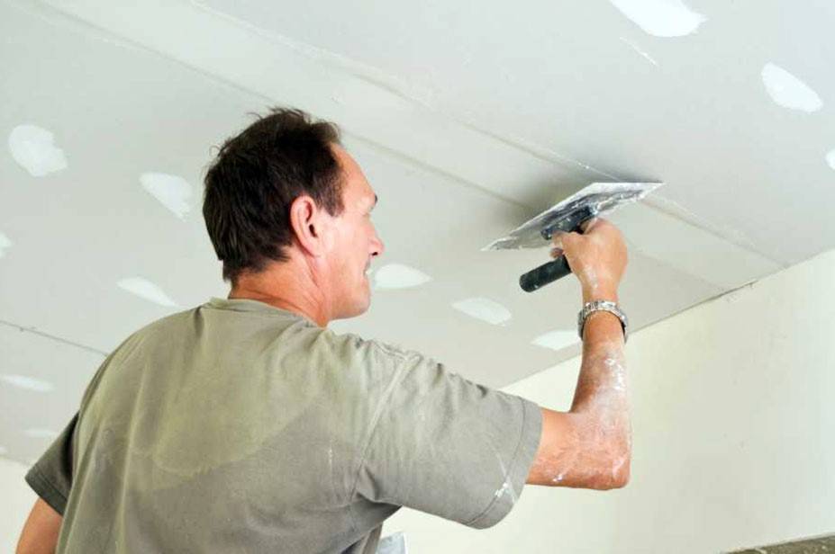 - При помощи шпаклевки замазать все имеющиеся стыки. Благодаря этому удается равномерно нанести краску и придать потолку вид гипсовой конструкции.