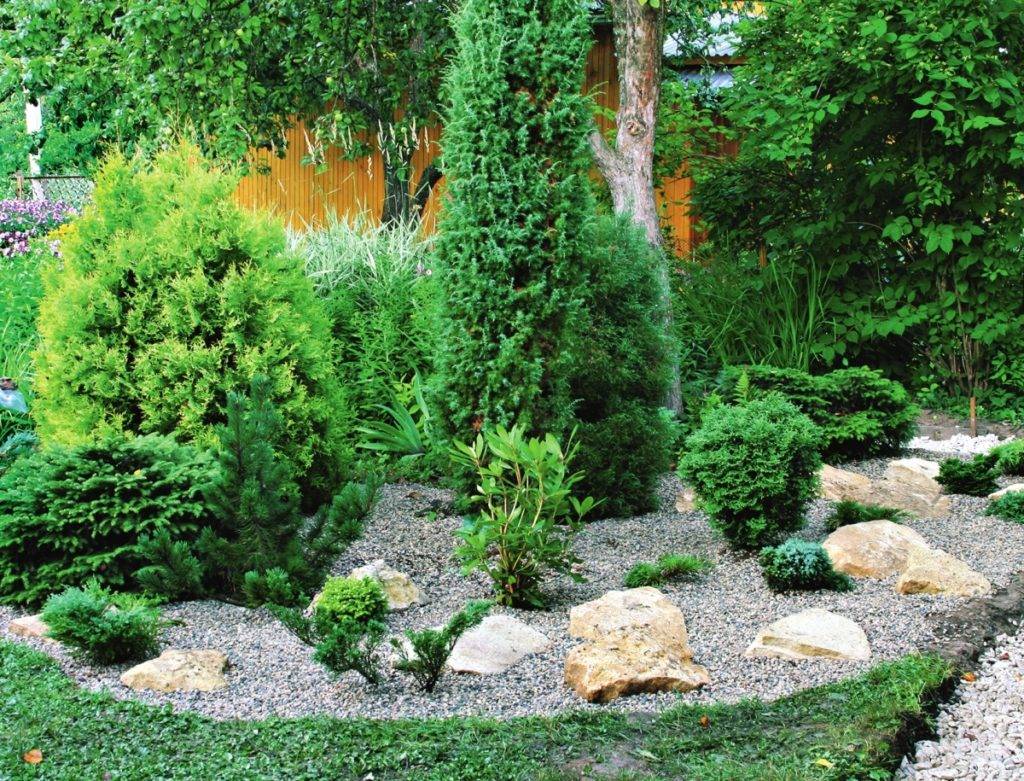 Хвойные кустарники и деревья, как элемент декора каменных клумб