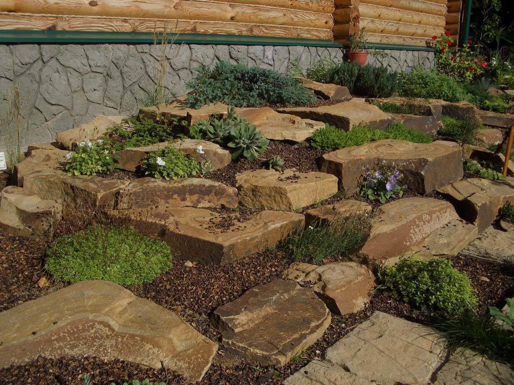 Известняк легко растрескивается, еще легче покрывается мхом, и эти его особенности, как и цветное разнообразие песчаника, также можно обыграть, создавая цветник.