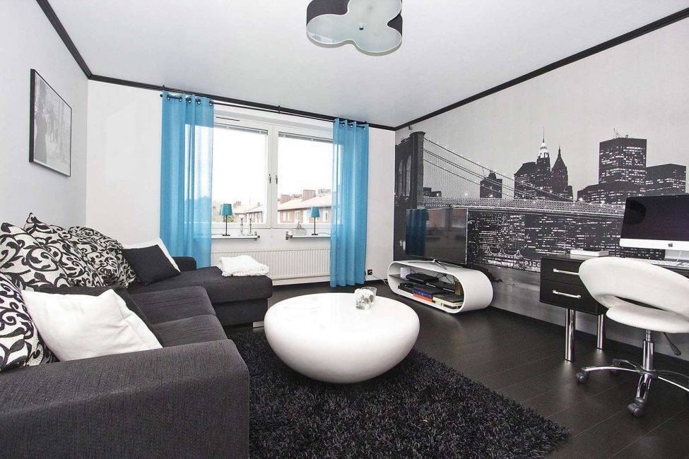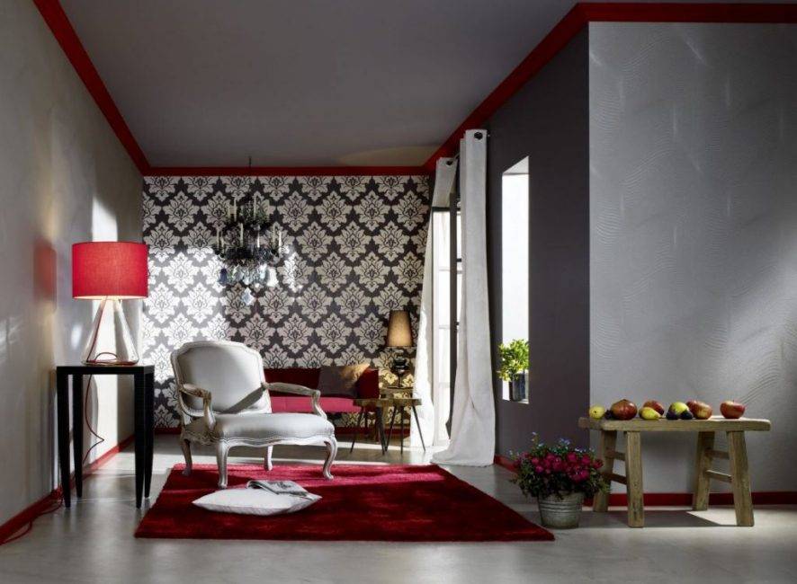 Достаточно выбрать плинтуса, гардины и половое покрытие правильного цвета. Предпочтительнее использовать однотонные предметы интерьера, так как слишком большая декоративная загруженность сделает дизайн интерьера чересчур напыщенным и нелепым.