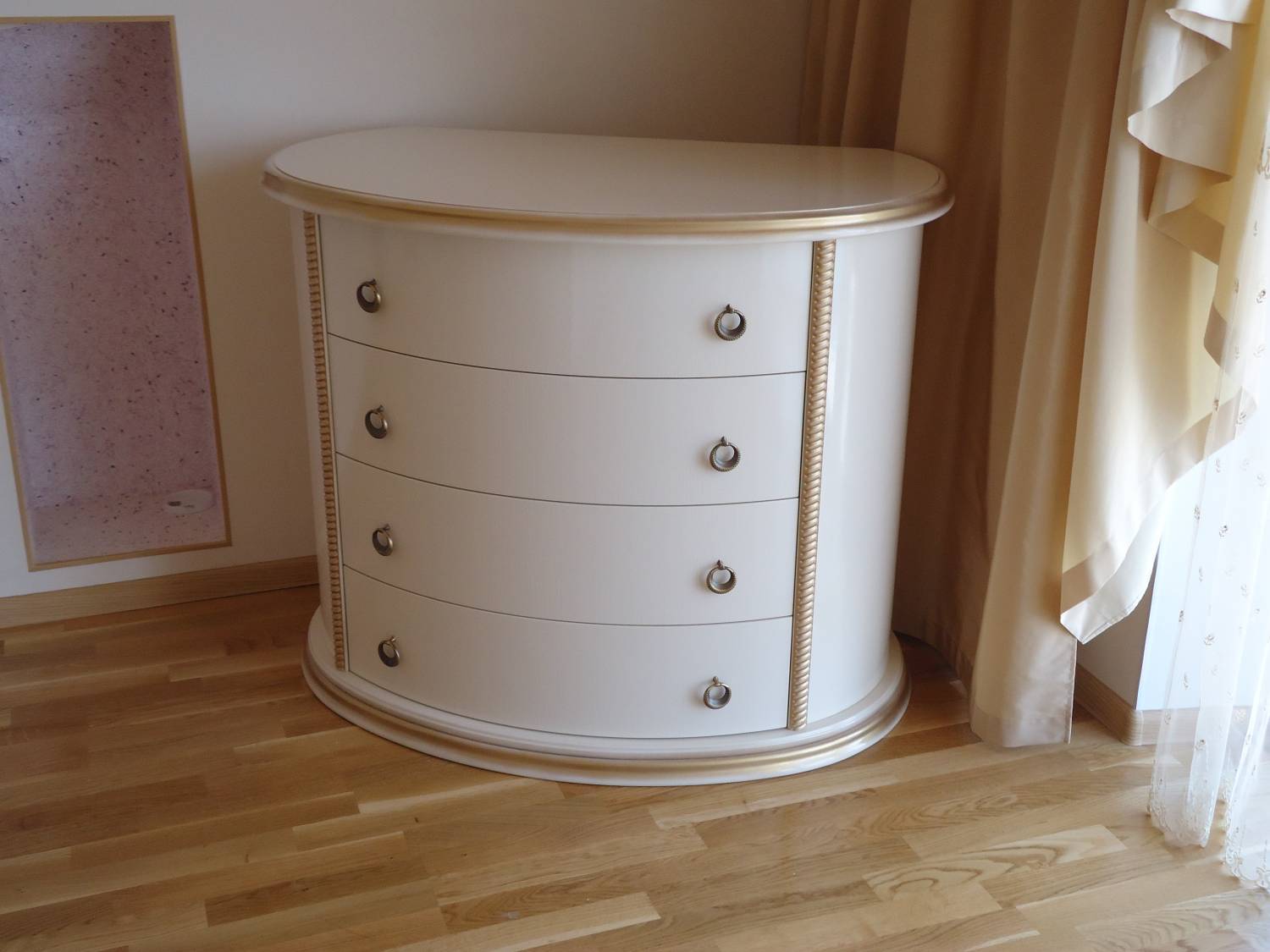 Оригинальным решением в интерьере станет радиусные комоды, подходящие для стиля хай-тек или модерна. Контуры их криволинейны, напоминающие полукруг или эллипс. Существуют и круглые комоды, в которых ящики выдвигаются по радиусу. Пользование секциями очень удобно, если их используют два человека, так они повернуты в разные стороны.