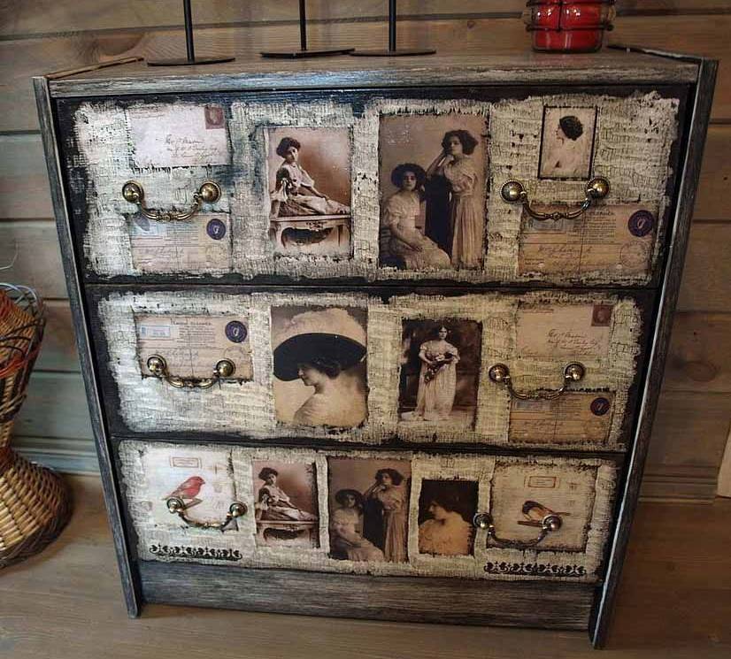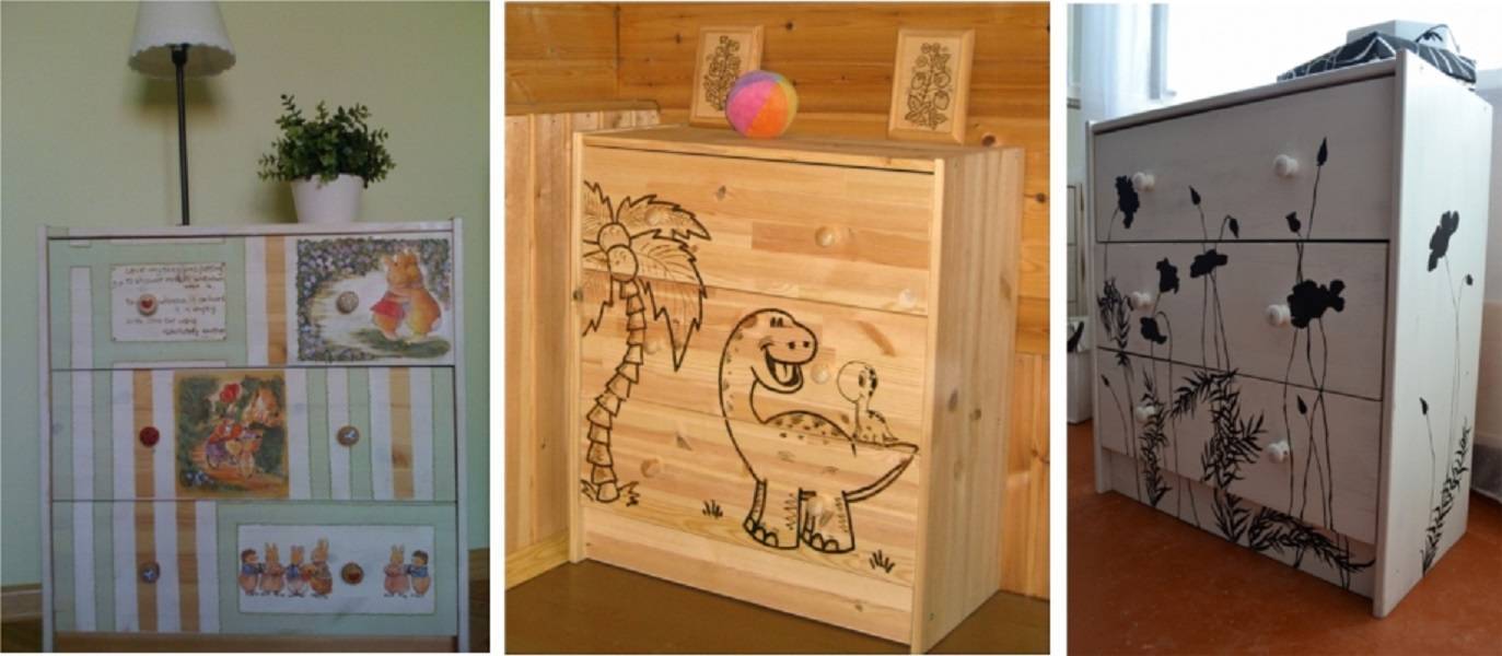 Оригинальные примеры декорирования старого комода представлены на фото: