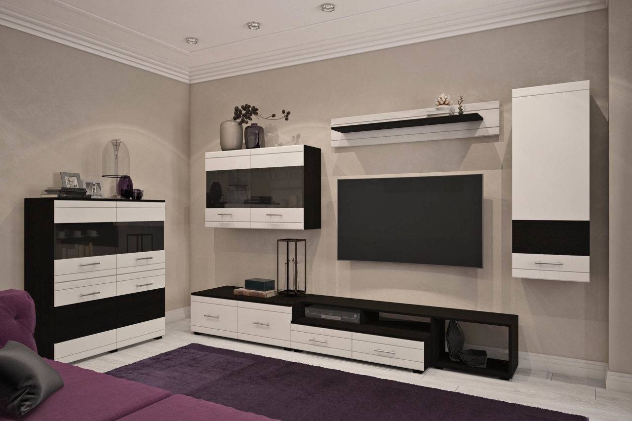 Фактически в состав модульной гостиной могут входить многочисленные элементы, но среди основных отметим следующие: