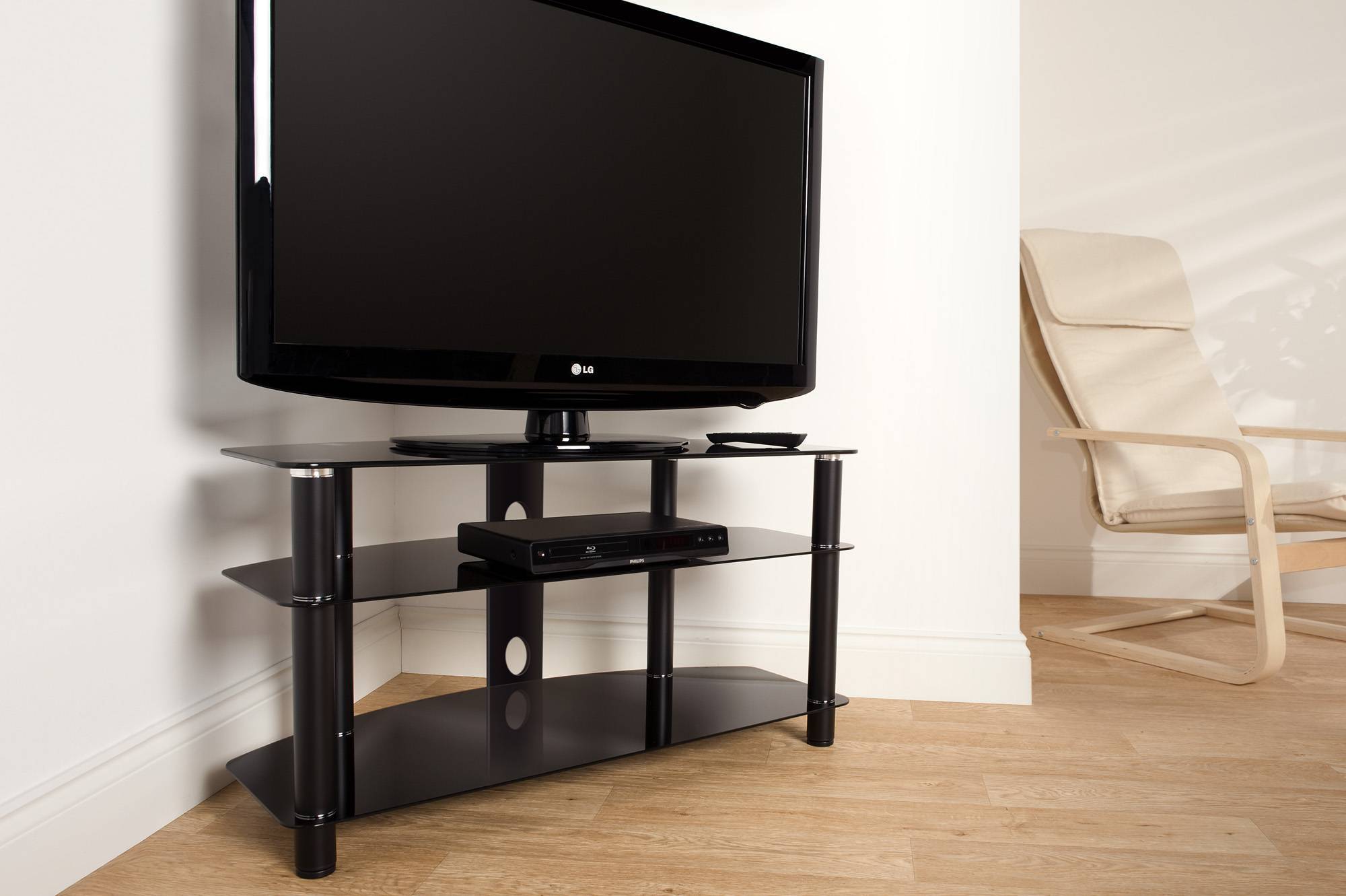 Для небольших по площади гостиных или спальных комнат больше подойдёт модель с угловой конфигурацией. Угловая тумба под телевизор экономит пространство, не загромождает скромные размеры городской квартиры.