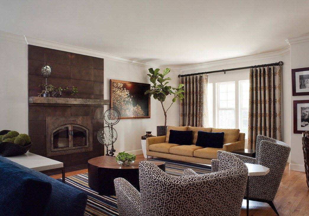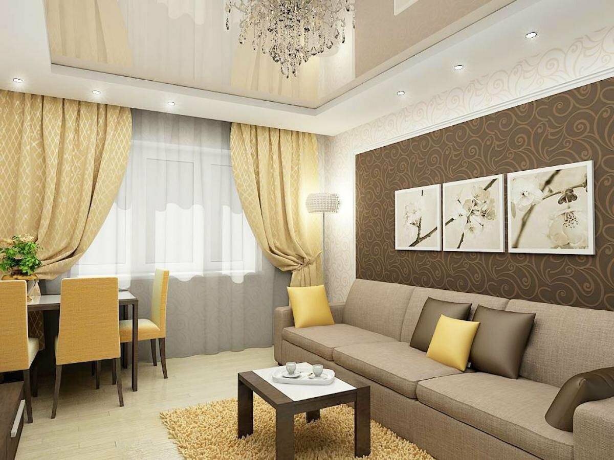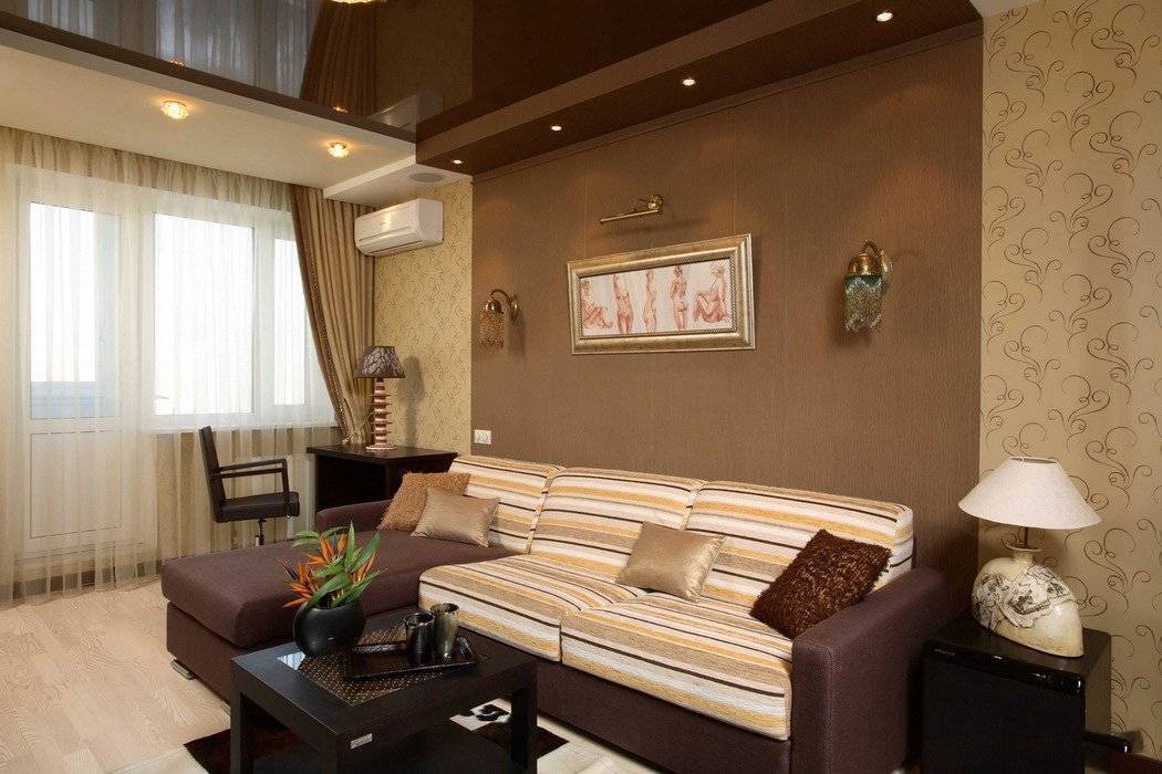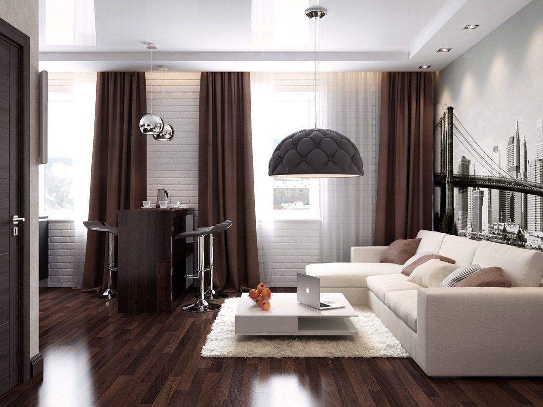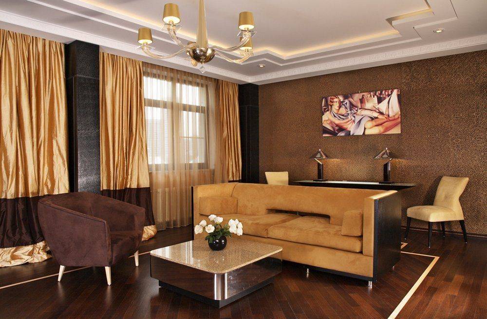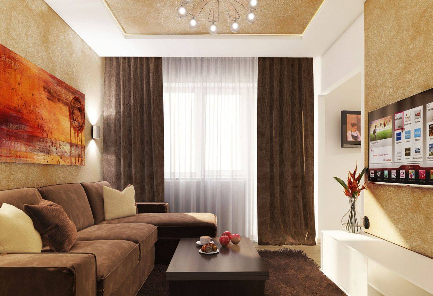 Интерьер гостиных с небольшими размерами не приветствует шторы на окнах тёмных или коричневых оттенков. Лучшим вариантом для таких помещений будут занавески светлого тона с золотистыми или бронзовыми бликами. Шторы коричневых оттенков предпочтительно используют в просторных гостиных.