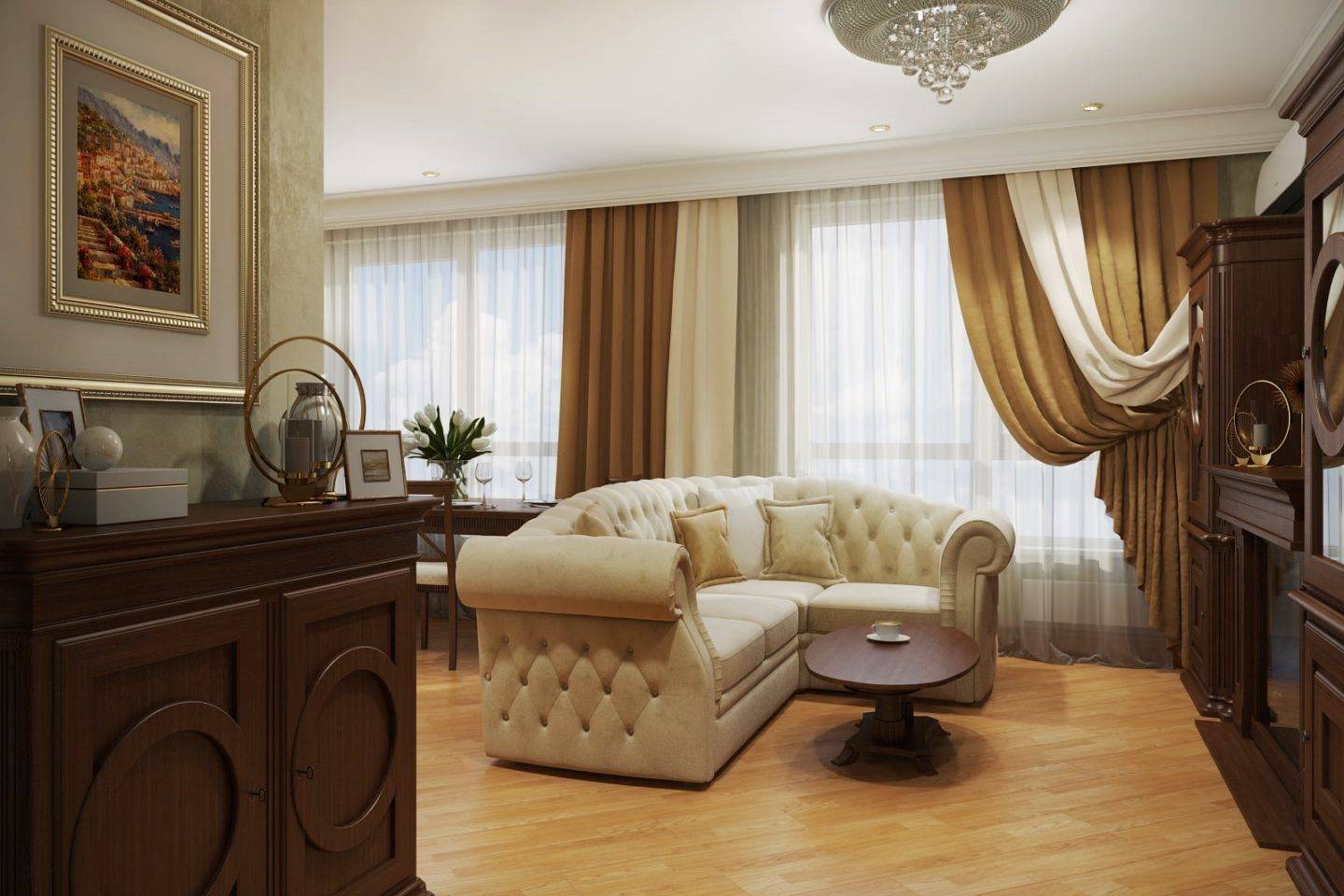 Если помещение просторное, можно отдать предпочтение австрийским или французским занавесям, традиционным портьерам из тяжелых материалов, декорировать их ламбрекеном.