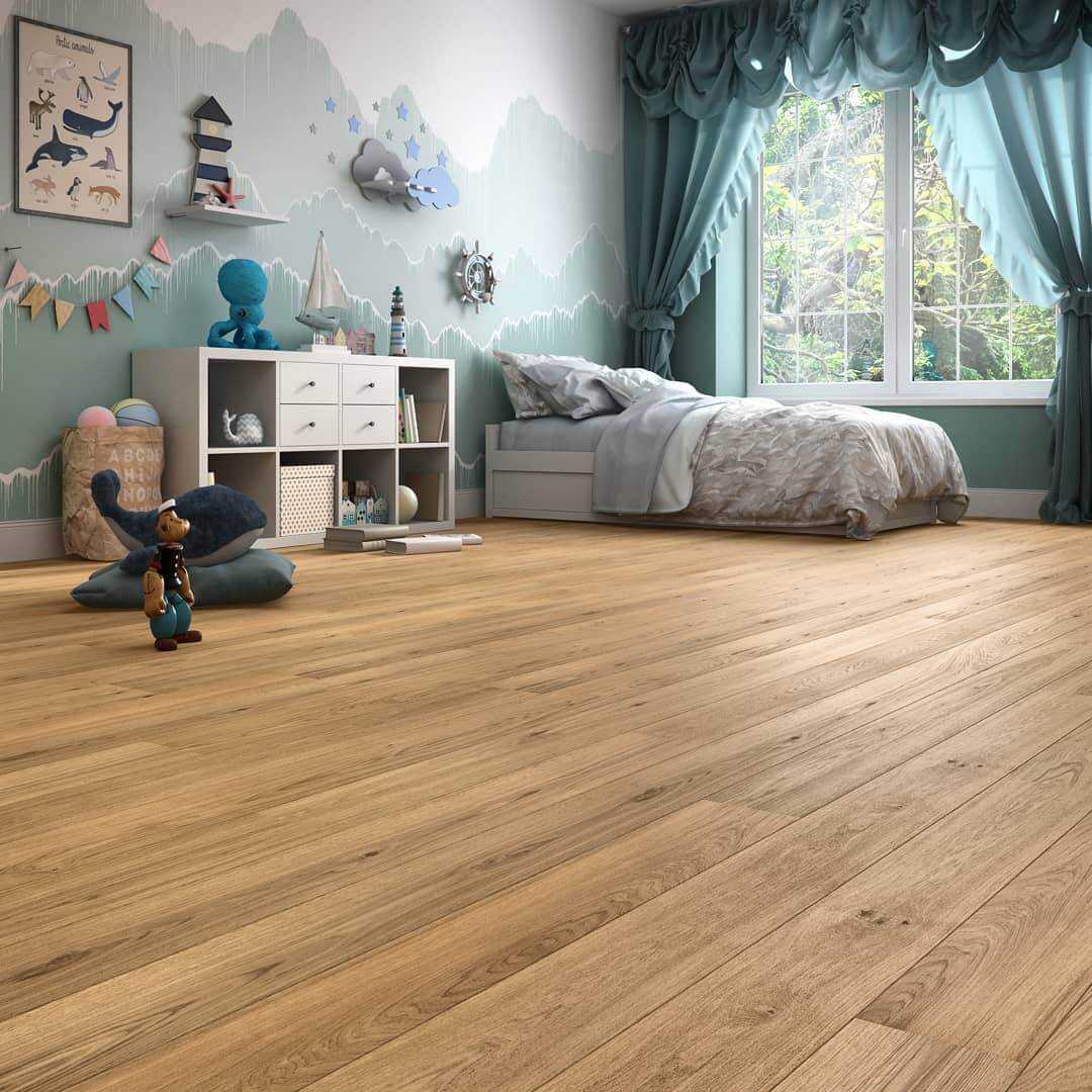 Светлые древесные оттенки в детской комнате.