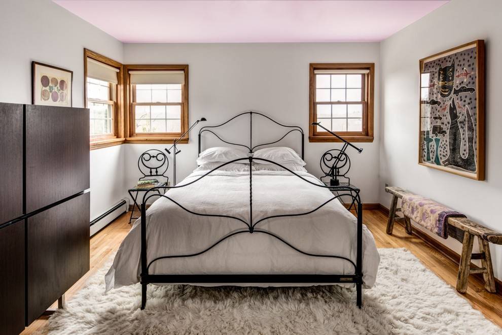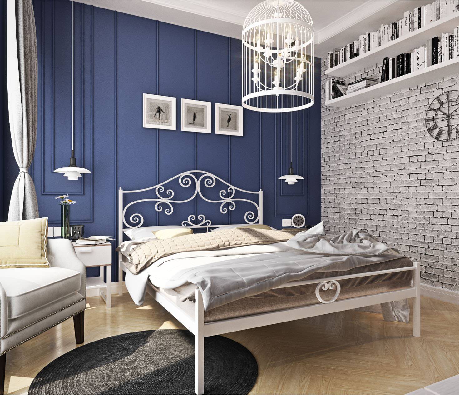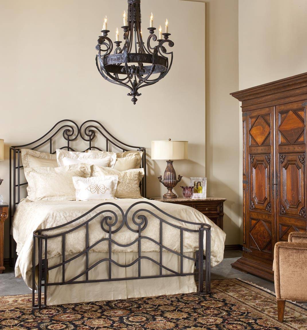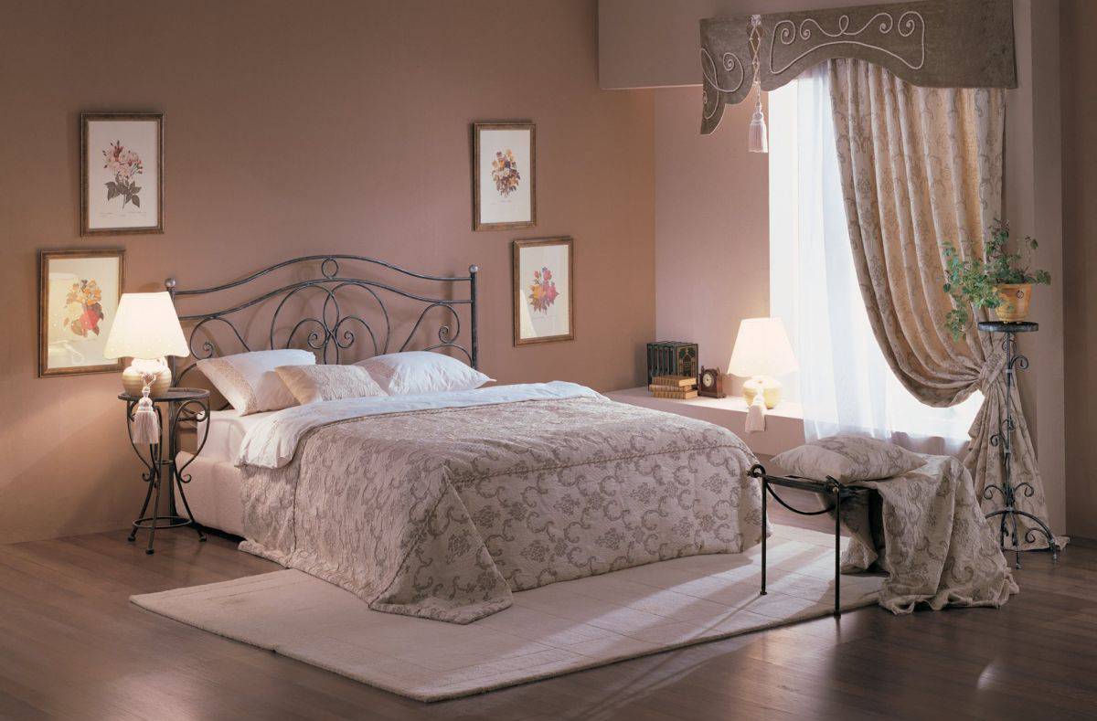 кованная спинка с замысловатым узором украсит эклетичный интерьер спальни