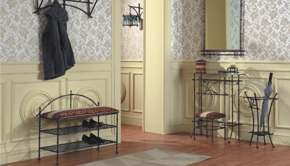 Кованные изделия весьма престижно смотрятся. Но главным их преимуществом есть долгий срок службы. Да и поломать их куда сложнее, чем деревянные изделия. Кованая мебель в прихожую берет свое начало еще в древних временах.
