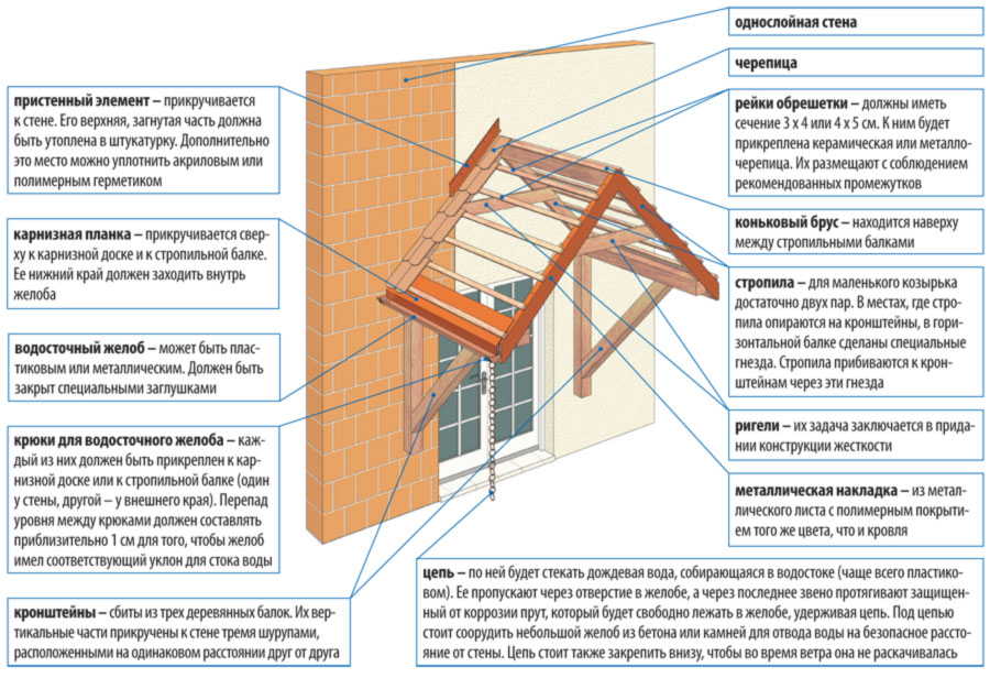 Эти части козырька выполняют из бруса небольшого сечения или доски достаточно толщины. Они объединяются в готовом каркасе посредством коньковой доски. Для установки необходимого наклона, на коньковой доске делается соответствующий запил. Для повышения жёсткости прямоугольные элементы укрепляются между собой отдельными распорными брусками – ригелями.