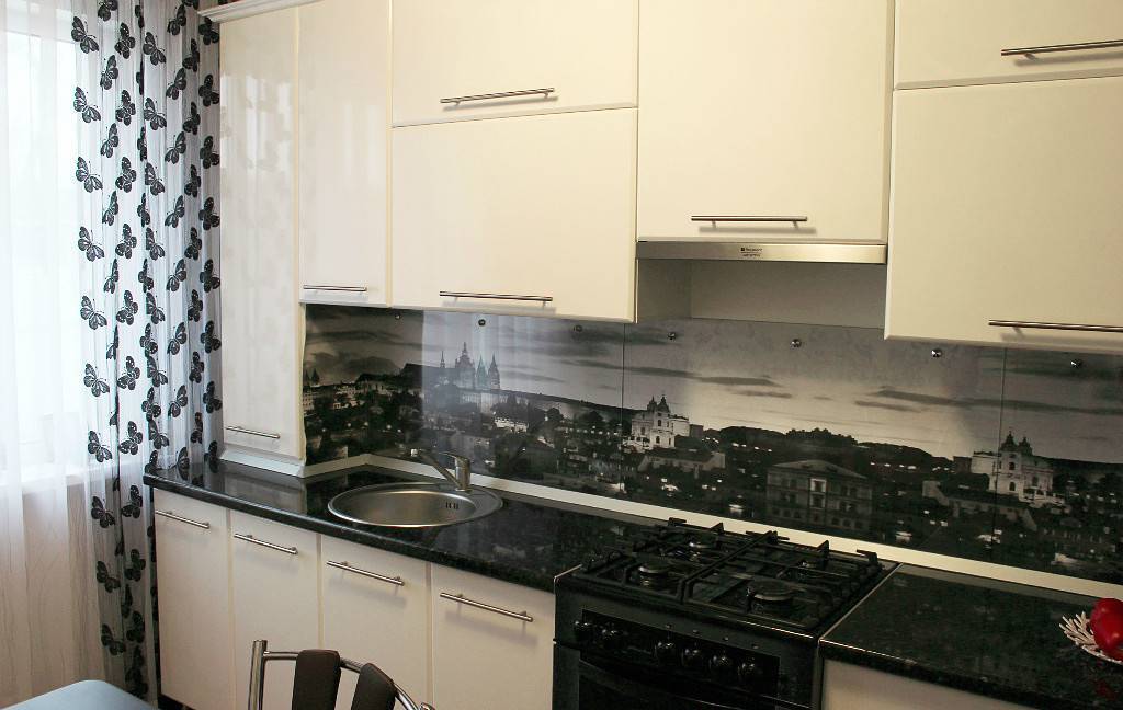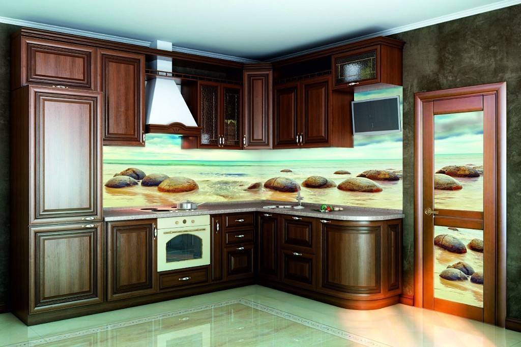 Хорошо смотрятся стеновые панели из того же материала, из которого изготавливается сама кухня. Большой популярностью пользуются красочные привлекательные фартуки из стекла с фотопечатью.
