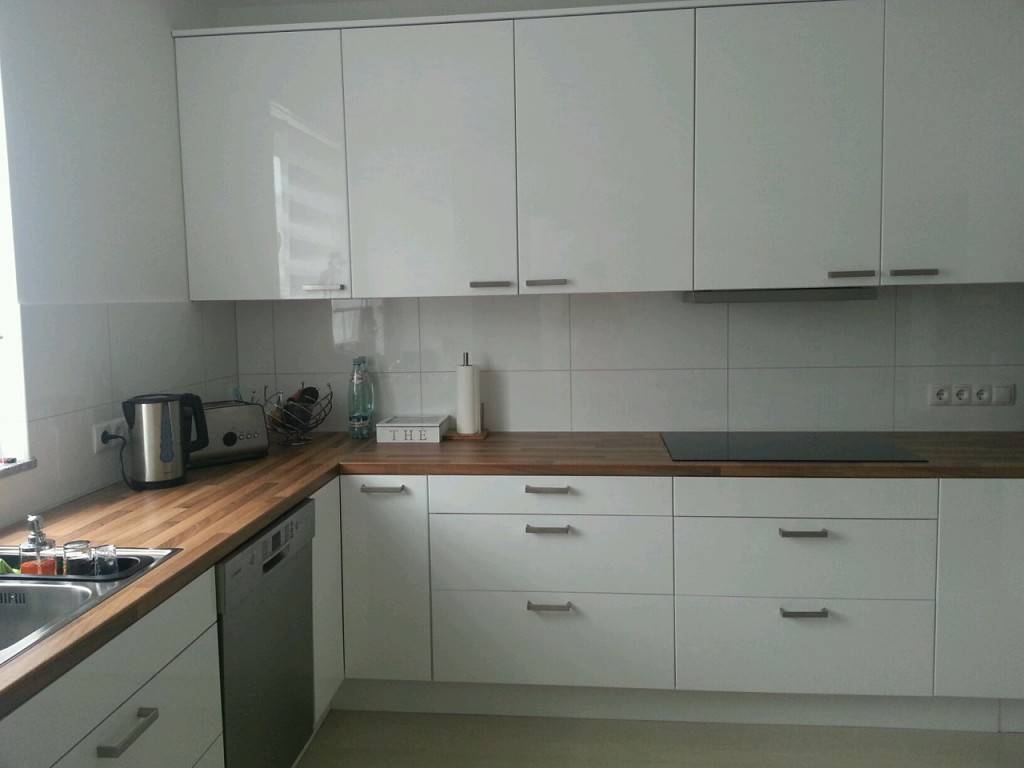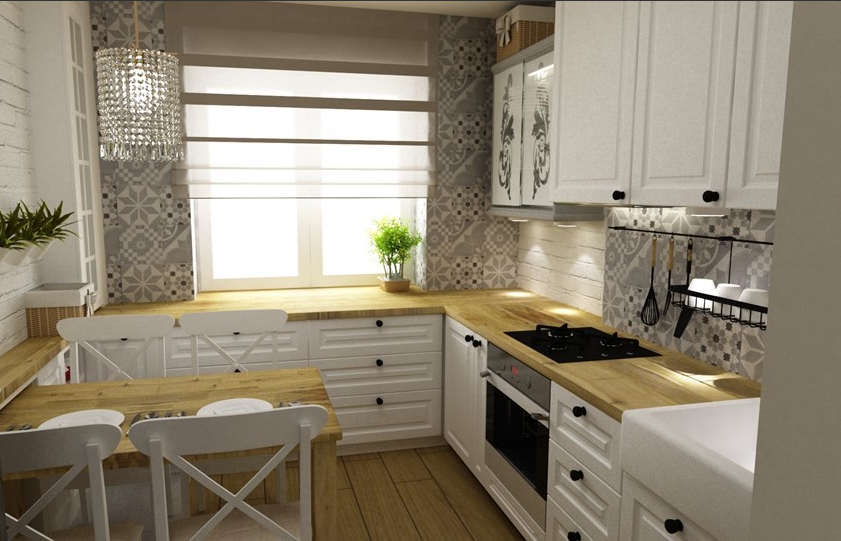 Немного разбавить стерильность основного цвета может пол и столешница в тон пола. Стены часто окрашиваются обычной краской или наклеиваются светлые обои с орнаментом.